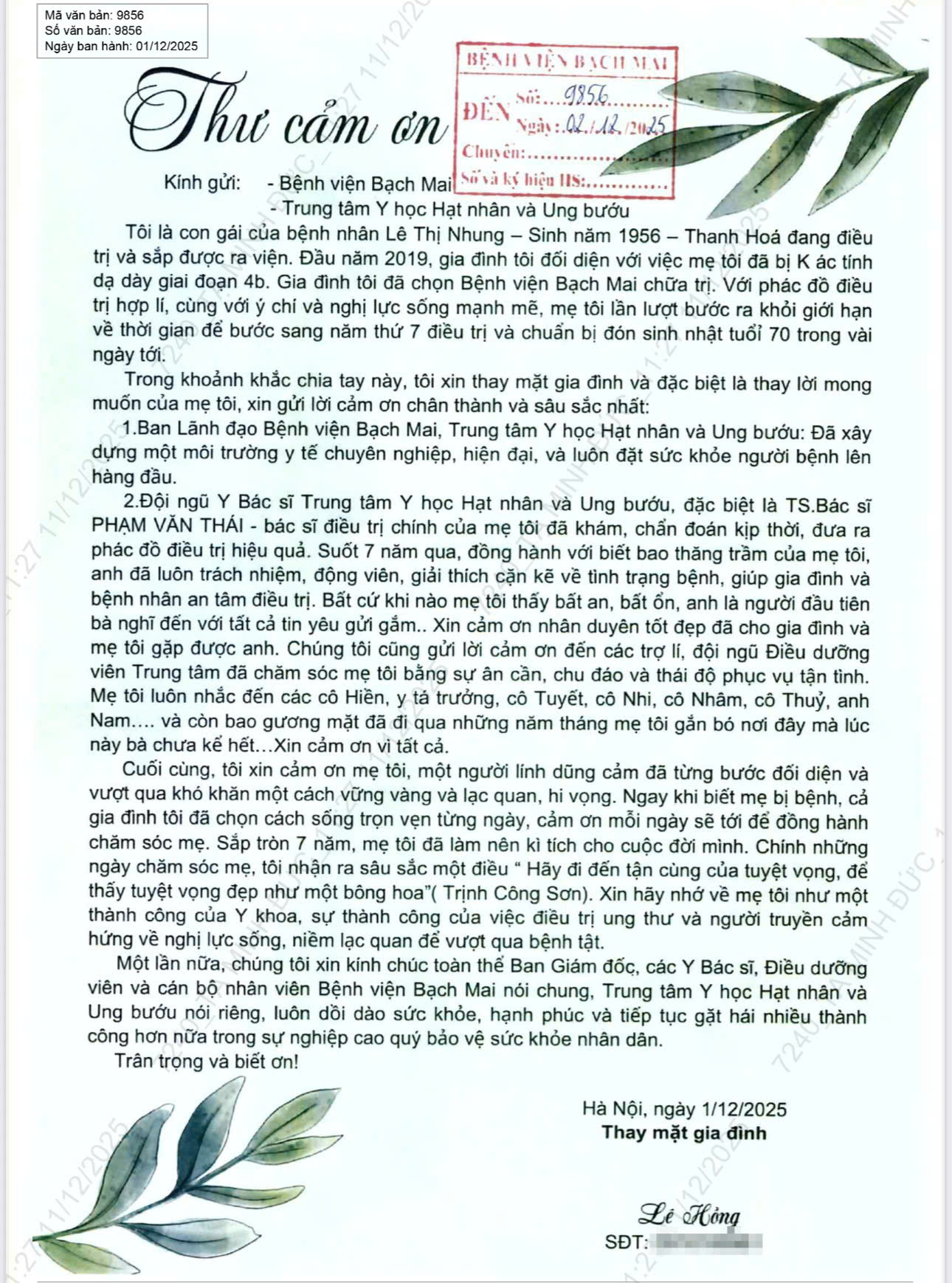 Phía sau mỗi lá thư cảm ơn là sự trân trọng dành cho những nỗ lực âm thầm của đội ngũ y bác sĩ, điều dưỡng, kỹ thuật viên và nhân viên y tế - những người không chỉ điều trị bệnh mà còn mang đến sự bình an cho người bệnh trong những ngày khó khăn nhất.
