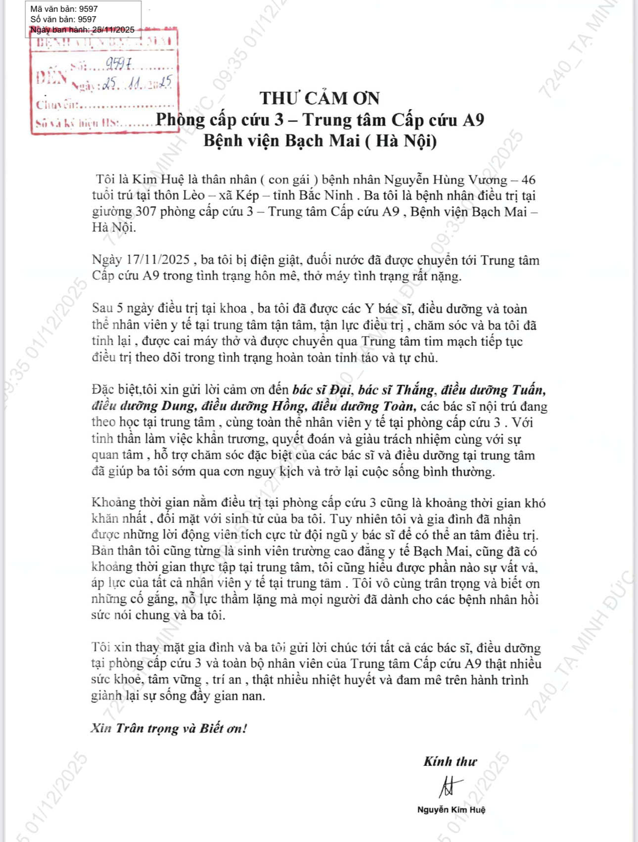 Trong lá thư gửi bệnh viện, bệnh nhân xúc động viết: “Trong lúc tôi vô cùng lo lắng và bối rối, chính hai bác sĩ đã không quản khó khăn, dành trọn tâm huyết để tìm ra căn nguyên thực sự của bệnh. Sự tận tâm ấy không chỉ cứu tôi về thể chất mà còn là nguồn động lực tinh thần lớn lao trong suốt thời gian nằm viện”.