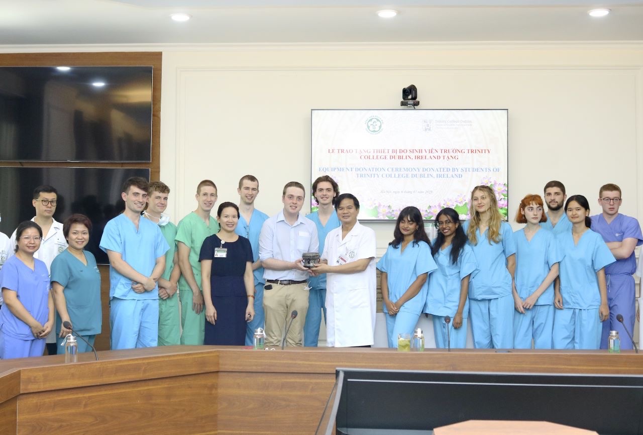 Giám đốc Đào Xuân Cơ tiếp nhận thiết bị y tế do sinh viên trường Trinity College Dublin trao tặng Bệnh viện