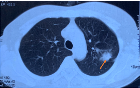 Kết quả chụp cắt lớp vi tính (CT) lồng ngực cho thấy khối u thùy trên phổi trái kích thước 20x15mm, bờ tua gai, xâm lấn rãnh liên thùy, kèm theo nhiều nốt mờ rải rác hai phổi, kích thước 5-10mm, phù hợp với tổn thương thứ phát, cùng hạch rốn phổi trái kích thước 10mm.