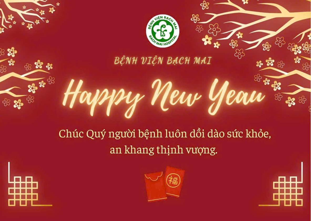 Ảnh 4: Một tấm thiệp chúc Tết đơn giản có logo Bệnh viện Bạch Mai kèm dòng chữ "Chúc mừng năm mới 2026"