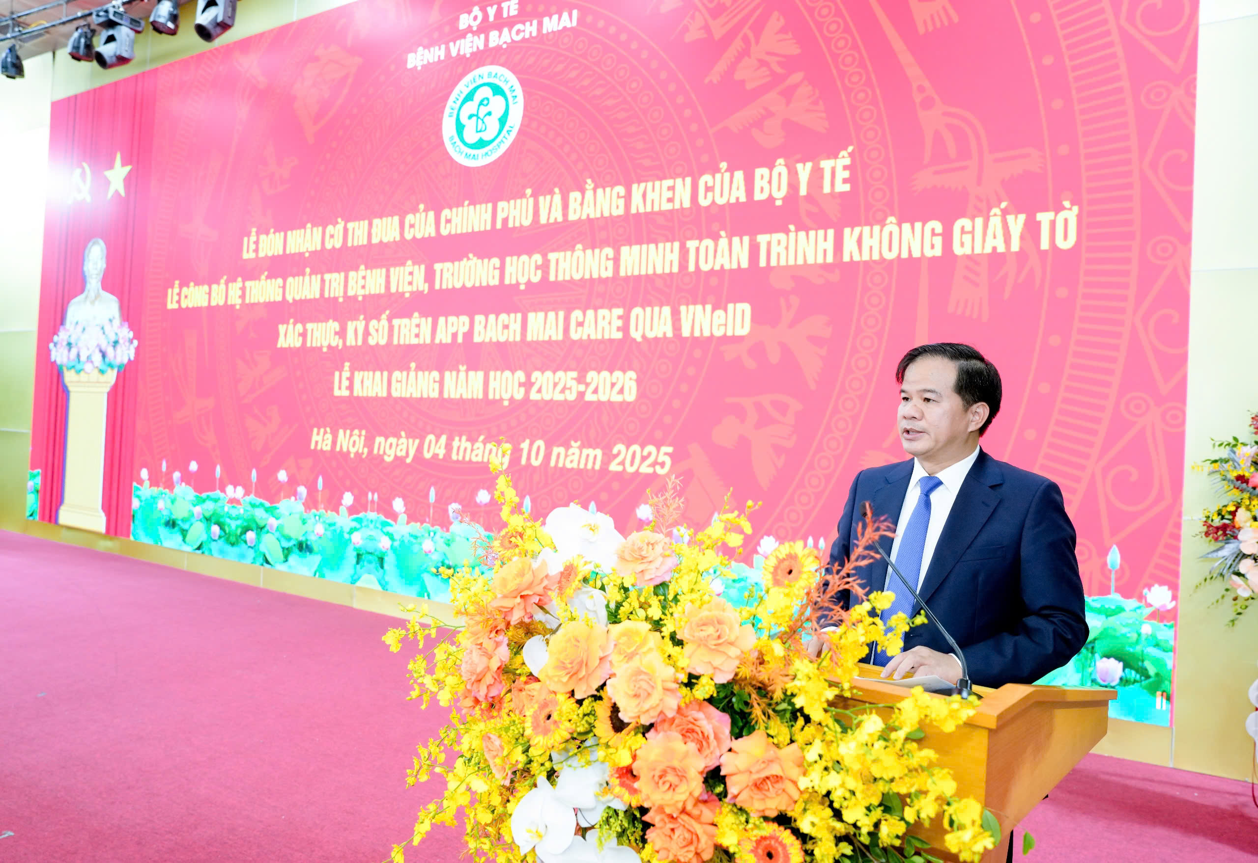 Ngày đăng: 04/10/2025Tác giả: Diệu Hiền - Thành DươngChiều 4/10, trong không khí trang trọng và đầy cảm xúc, Bệnh viện Bạch Mai đã long trọng tổ chức Lễ đón nhận cờ thi đua của Chính Phủ; Công bố hệ thống quản trị bệnh viện, trường học thông minh toàn trình không giấy tờ; Xác thực, ký số trên app Bạch Mai care qua VNeID. Sự kiện không chỉ đánh dấu một cột mốc lịch sử trên hành trình xây dựng y tế hiện đại, công bằng, hiệu quả, bền vững mà còn là lời cam kết mạnh mẽ, tiên phong của đội ngũ áo blouse trắng trong kỷ nguyên số.