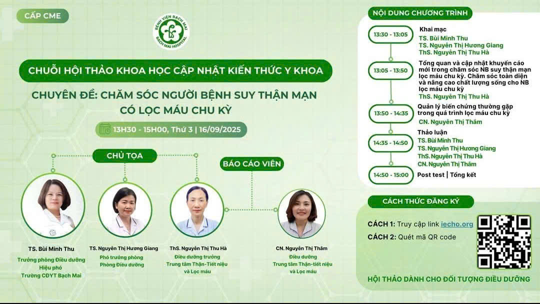 Buổi hội thảo đã thu hút đông đảo điều dưỡng tham dự, tạo diễn đàn chia sẻ kinh nghiệm thực tiễn trong chăm sóc và quản lý người bệnh suy thận mạn lọc máu chu kỳ. Nhiều khuyến cáo mới từ Hội Thận học Việt Nam, KDIGO và WHO cũng được cập nhật, góp phần chuẩn hóa quy trình điều dưỡng và nâng cao chất lượng điều trị. Hoạt động này khẳng định quyết tâm của Bệnh viện Bạch Mai trong việc phát triển mô hình chăm sóc toàn diện: Y khoa - Dinh dưỡng - Tâm lý - Xã hội - Phục hồi chức năng, hướng đến mục tiêu cuối cùng là cải thiện chất lượng cuộc sống cho người bệnh suy thận mạn.