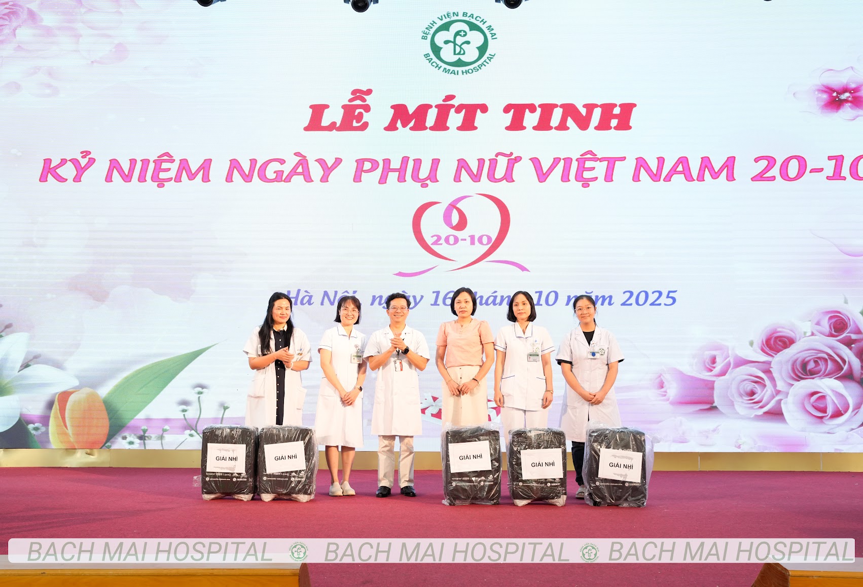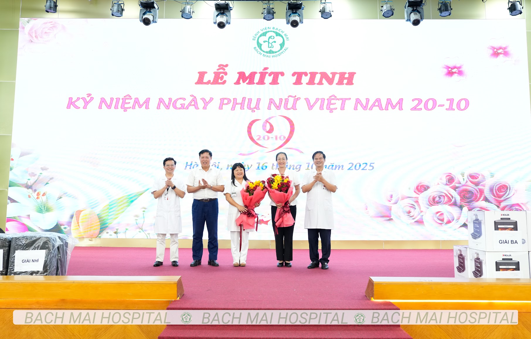 Ngày đăng: 17/10/2025Tác giả: Nguyên Hà - Thành DươngTrong không khí hân hoan và trang trọng, chiều ngày 16/10/2025, Bệnh viện Bạch Mai tổ chức Lễ mít tinh kỷ niệm 95 năm Ngày thành lập Hội Liên hiệp Phụ nữ Việt Nam (20/10/1930 - 20/10/2025). Đây là dịp để tri ân, tôn vinh những đóng góp, cống hiến to lớn của đội ngũ nữ cán bộ, viên chức, người lao động trong suốt hành trình phát triển và giai đoạn chuyển mình mạnh mẽ của Bệnh viện.
