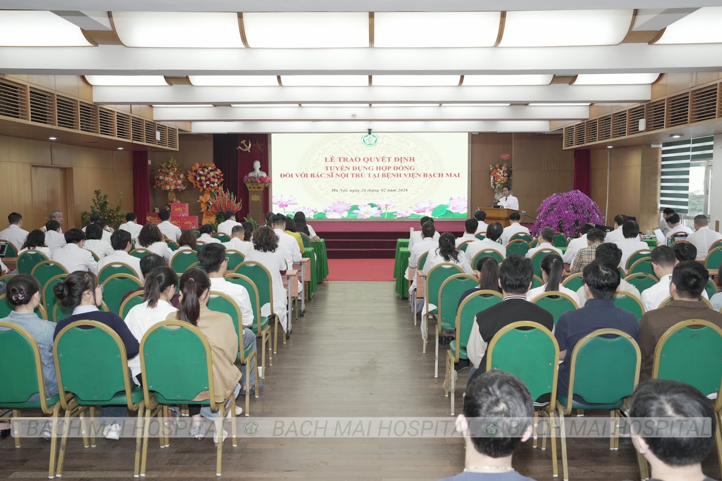 Ngày đăng: 26/02/2026Tác giả: Nguyên Hà - Thế AnhBệnh viện Bạch Mai vừa tổ chức Lễ trao quyết định tuyển dụng hợp đồng với hơn 100 bác sĩ nội trú - sự kiện mang ý nghĩa đặc biệt nhân kỷ niệm Ngày Thầy thuốc Việt Nam 27/2. Đây không chỉ là hoạt động nhân sự thường niên mà còn thể hiện rõ định hướng chiêu mộ, trọng dụng nhân tài, chuẩn bị đội ngũ tinh nhuệ cho giai đoạn phát triển mới của bệnh viện, đặc biệt hướng tới vận hành đồng bộ Cơ sở 2.