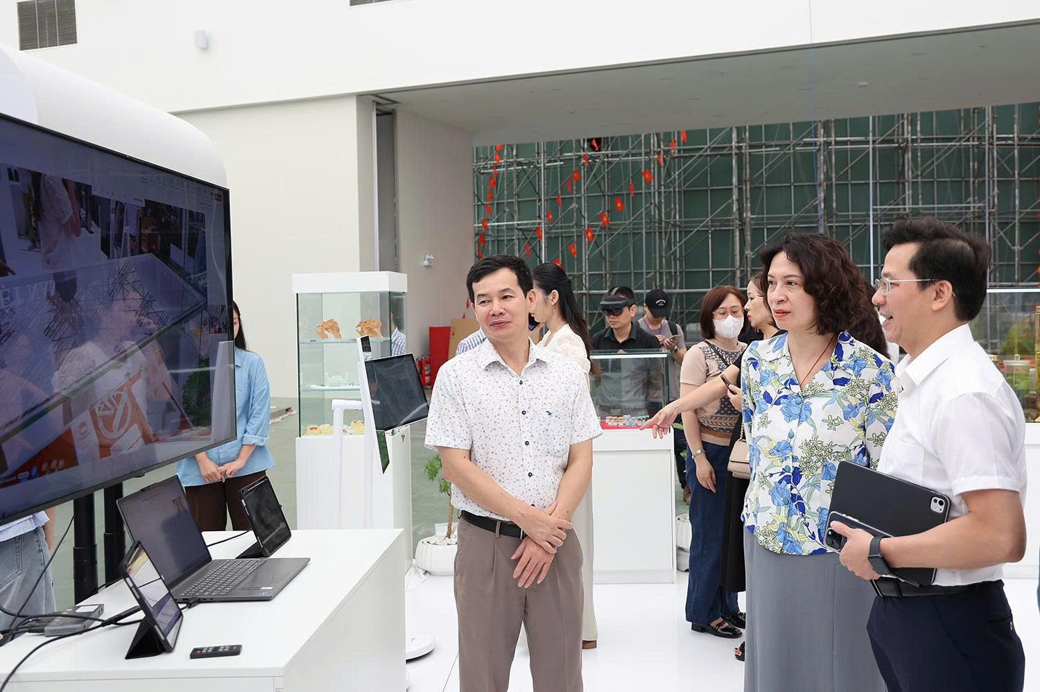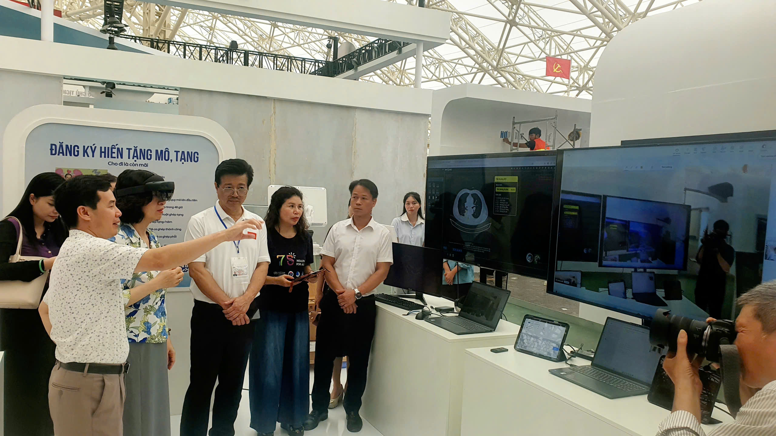Sáng ngày 22/8/2025, Thứ trưởng Bộ y tế Nguyễn Thị Liên Hương (áo hoa) và PGS.TS Vũ Văn Giáp, Phó Giám đốc Bệnh viện Bạch Mai sơ duyệt Gian hàng của Bộ y tế tại Triển lãm