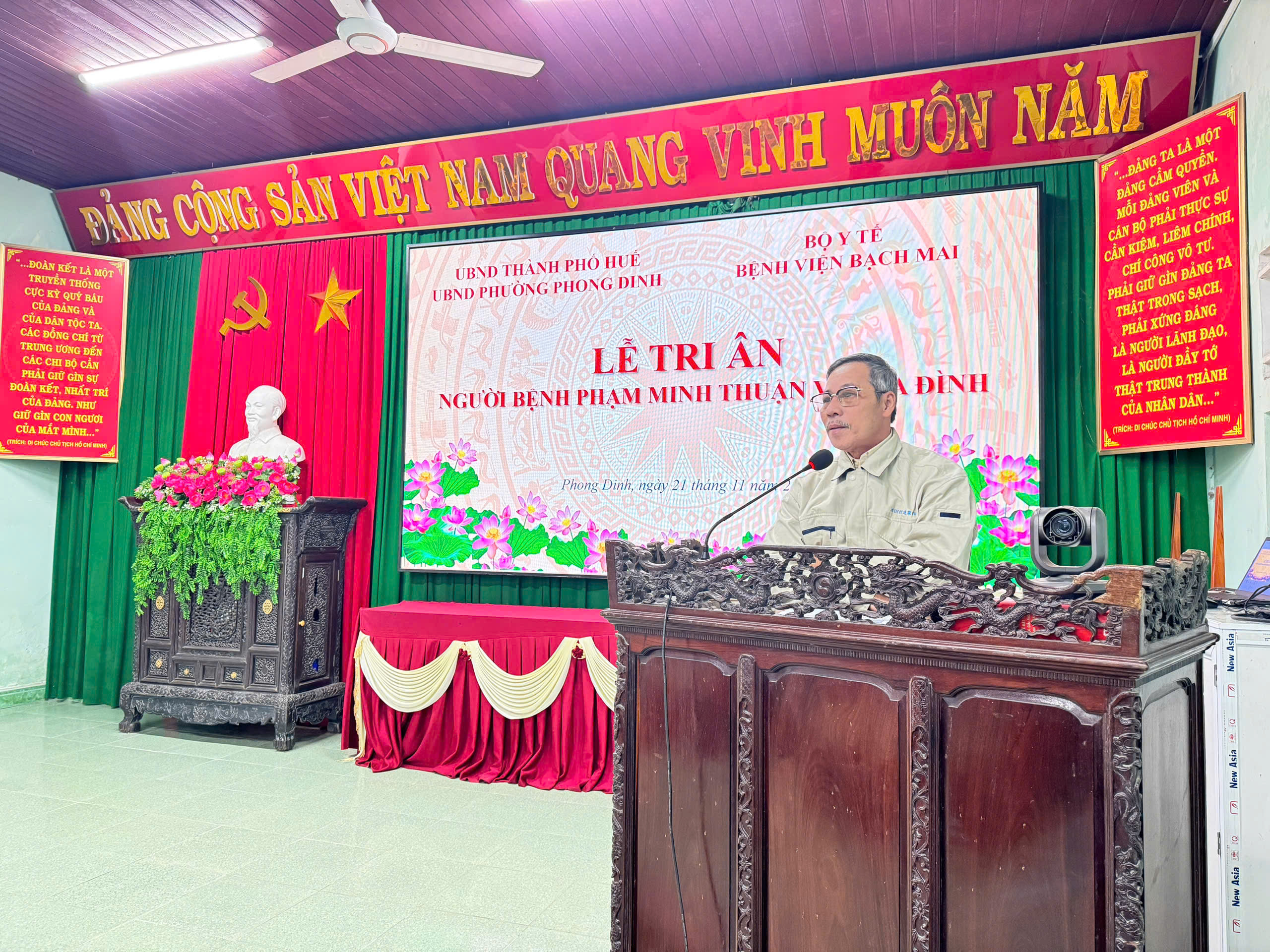 Ngày đăng: 23/11/2025Tác giả: Tin, ảnh: Lê ĐạtNgày 21/11/2025, tại Hội trường Đảng uỷ phường Phong Dinh - tỉnh Thừa Thiên Huế, Bệnh viện Bạch Mai phối hợp với UBND phường tổ chức Lễ tri ân người bệnh Phạm Minh Thuận và gia đình - người đã lựa chọn hiến tặng mô/tạng sau khi qua đời vì chết não, mang lại cơ hội sống cho nhiều bệnh nhân khác.