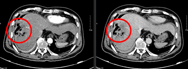Hình 1: Hình ảnh chụp cắt lớp vi tính ổ bụng: Nhu mô hạ phân thùy S7-8 có khối (vòng tròn đỏ) tỷ trọng hỗn hợp kích thước 81x51mm gồm phần tăng tỷ trọng của vật liệu can thiệp và nhiều bóng khí tạo thành ổ tụ khí trong nhu mô kèm phần hoại tử dạng dịch, không có huyết khồi.