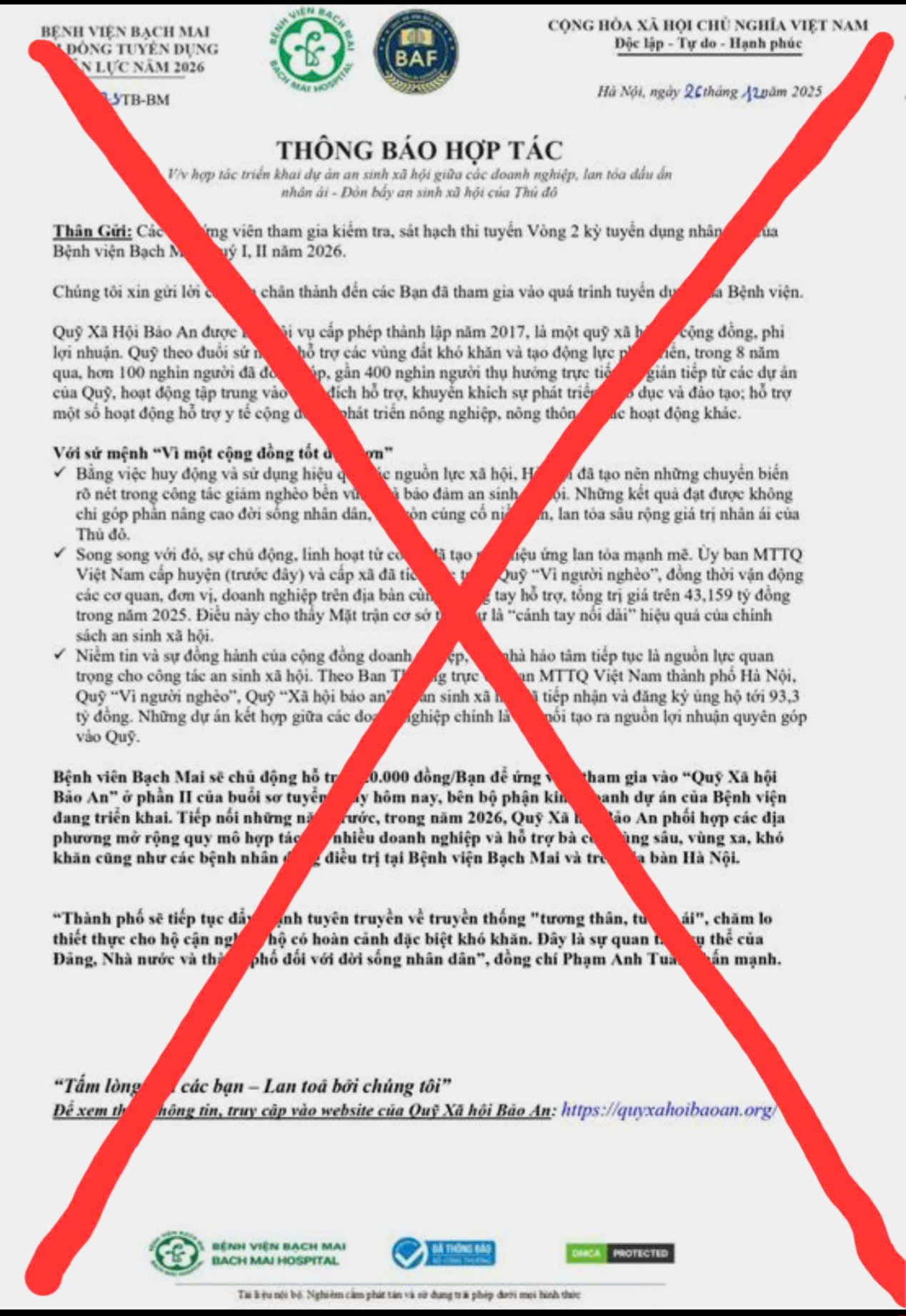 Tuy nhiên, thời gian gần đây đã xuất hiện tình trạng các đối tượng mạo danh cán bộ, lãnh đạo hoặc bộ phận liên quan của Bệnh viện Bạch Mai, sử dụng hình ảnh, logo, văn bản mang tên “thông báo hợp tác”, “quỹ xã hội”, “hỗ trợ ứng viên” để tiếp cận các học viên, ứng viên tham gia kỳ tuyển dụng.