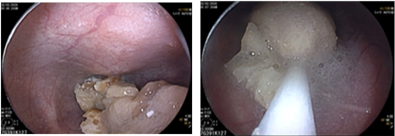 Nội soi dạ dày cho thấy thức ăn mắc lại trong thực quản. Dị vật được lấy ra kịp thời.