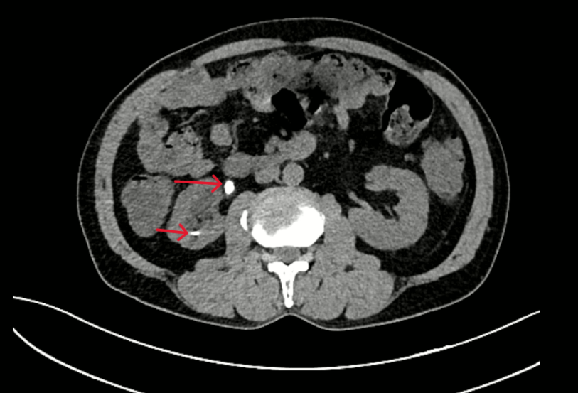 - Chụp CT bụng: Hình ảnh giãn đài bể thận và niệu quản phải do sỏi niệu quản đoạn 1/3 trên. Sỏi đài dưới thận phải.