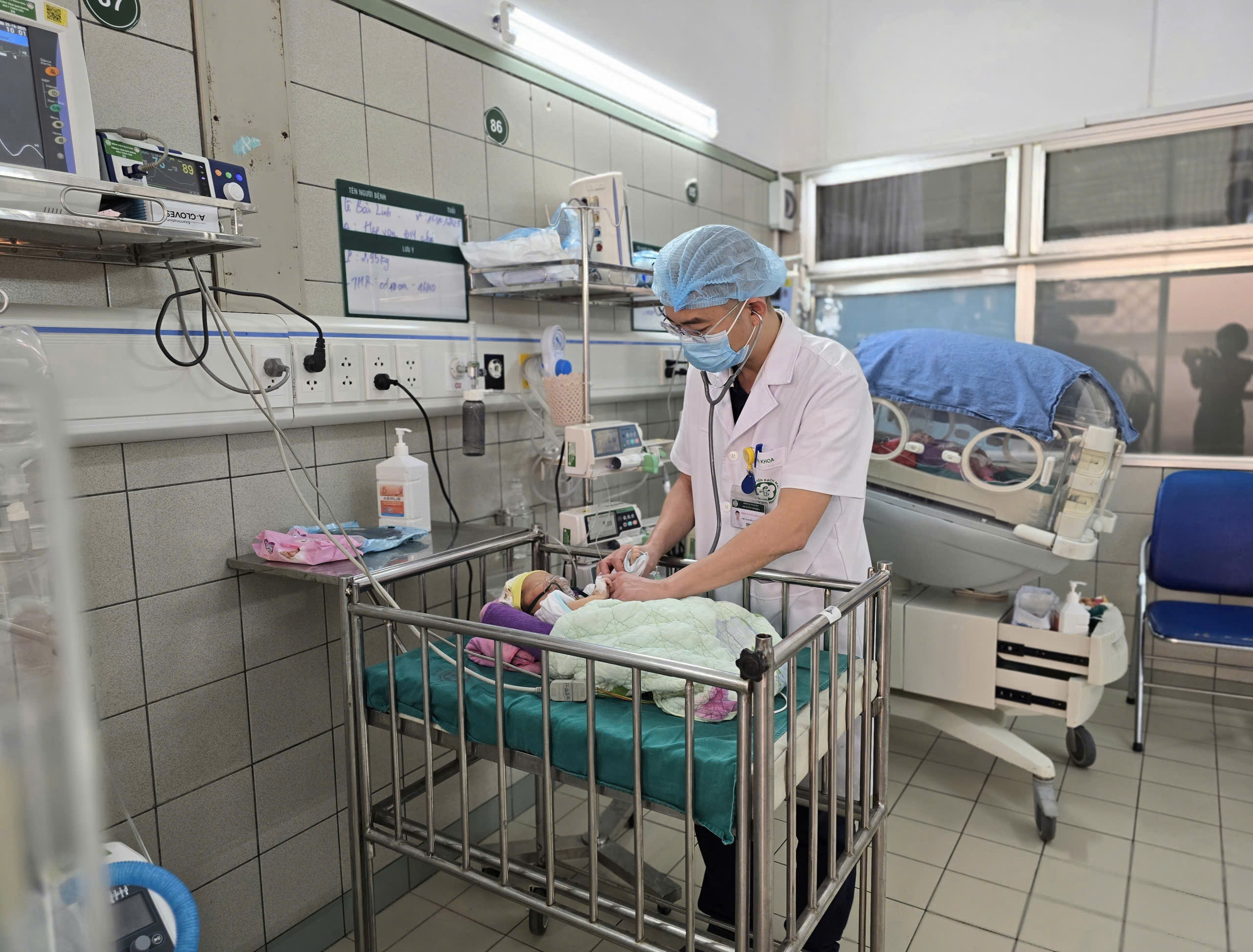 Bác sĩ Kiên thăm khám cho cháu bé đang được theo dõi tại Phòng Hồi sức sơ sinh, Trung tâm Nhi khoa