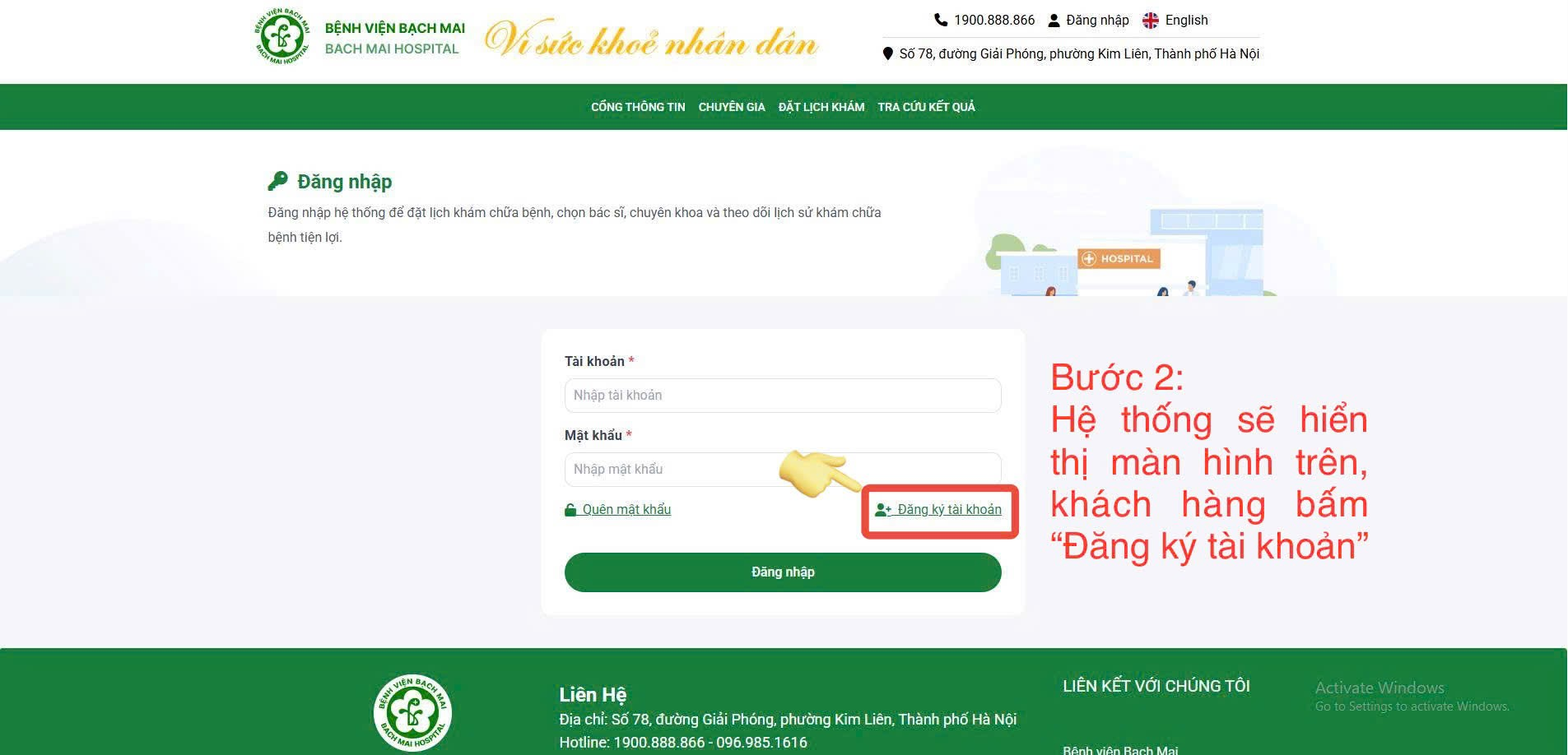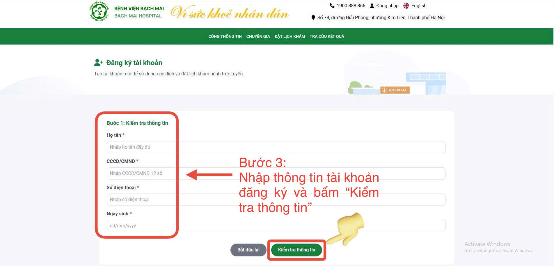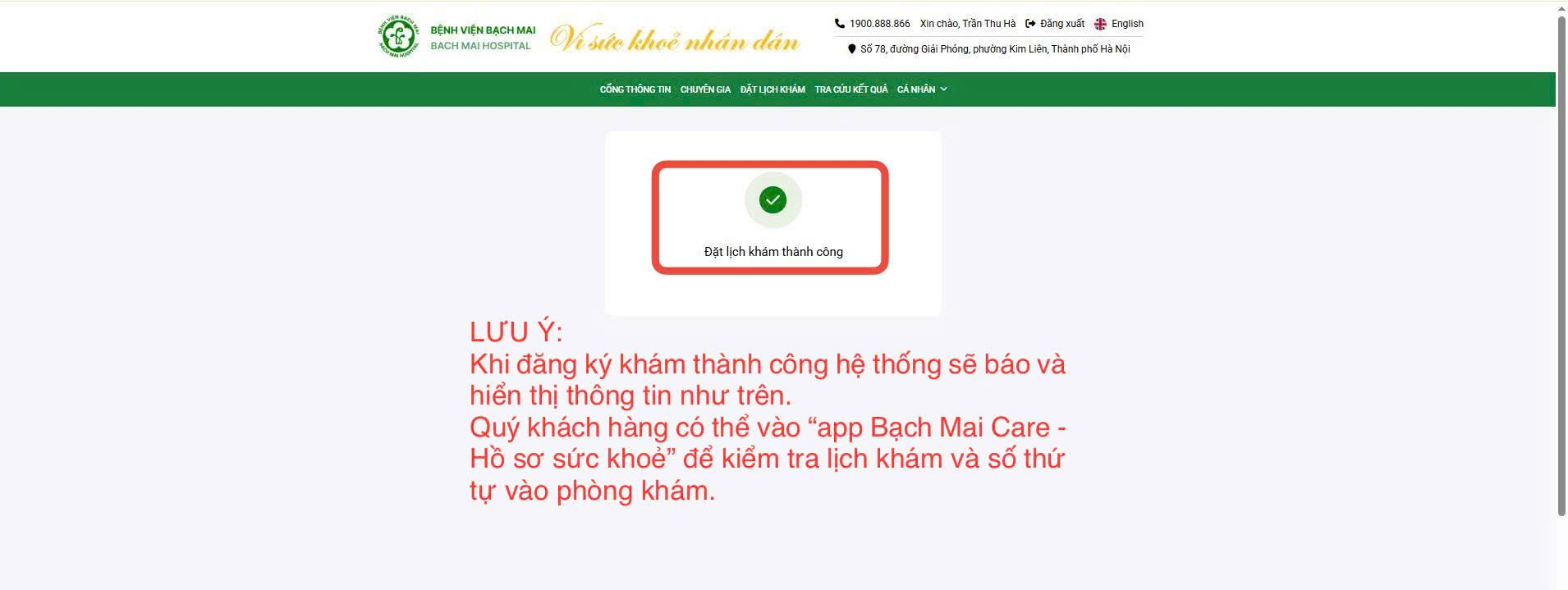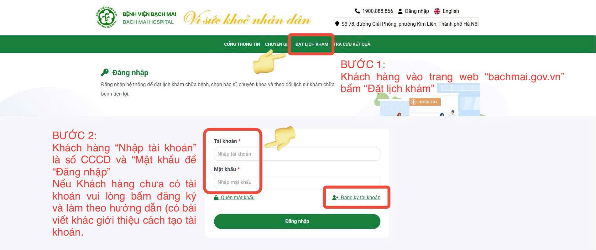 Vào website Bệnh viện Bạch Mai https://bachmai.gov.vn/ , chọn mục Đặt lịch khám và làm theo các bước dưới đây: