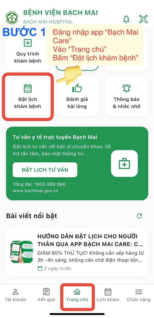 Vào website Bệnh viện Bạch Mai https://bachmai.gov.vn/ , chọn mục Đặt lịch khám và làm theo các bước dưới.