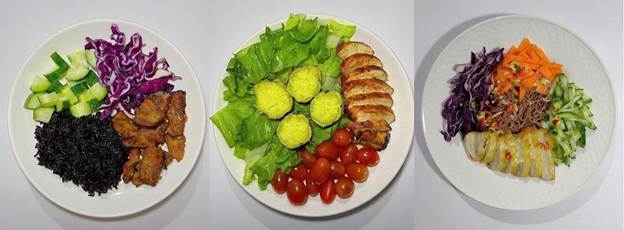 Cá thu sốt cà chua, đậu phụ luộc, ức gà áp chảo, hoặc trứng đúc thịt. |
