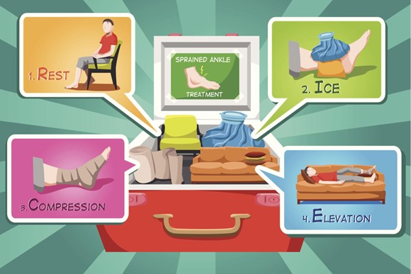 Nếu chẳng may gặp phải bong gân hoặc tổn thương mô mềm do vặn, xoắn khớp đột ngột, biểu hiện bằng đau, sưng nề, bầm tím quanh cổ chân, cổ tay… cần áp dụng ngay nguyên tắc R.I.C.E trong 48 giờ đầu: