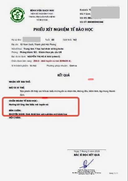 Kết quả xét nghiệm tế bào học sau đó xác định người bệnh mắc ung thư biểu mô tuyến vú giai đoạn sớm.