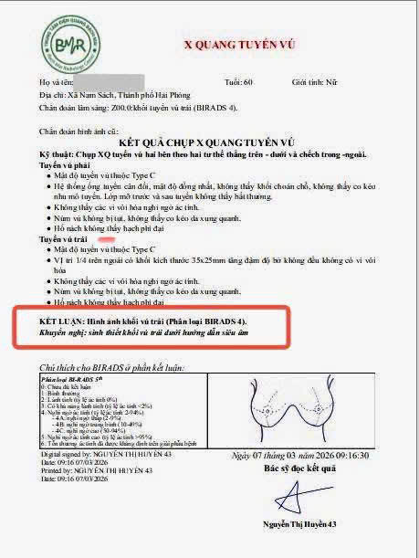 Hình ảnh khối u được phân loại BIRADS 4 trên siêu âm và chụp X-quang tuyến vú.