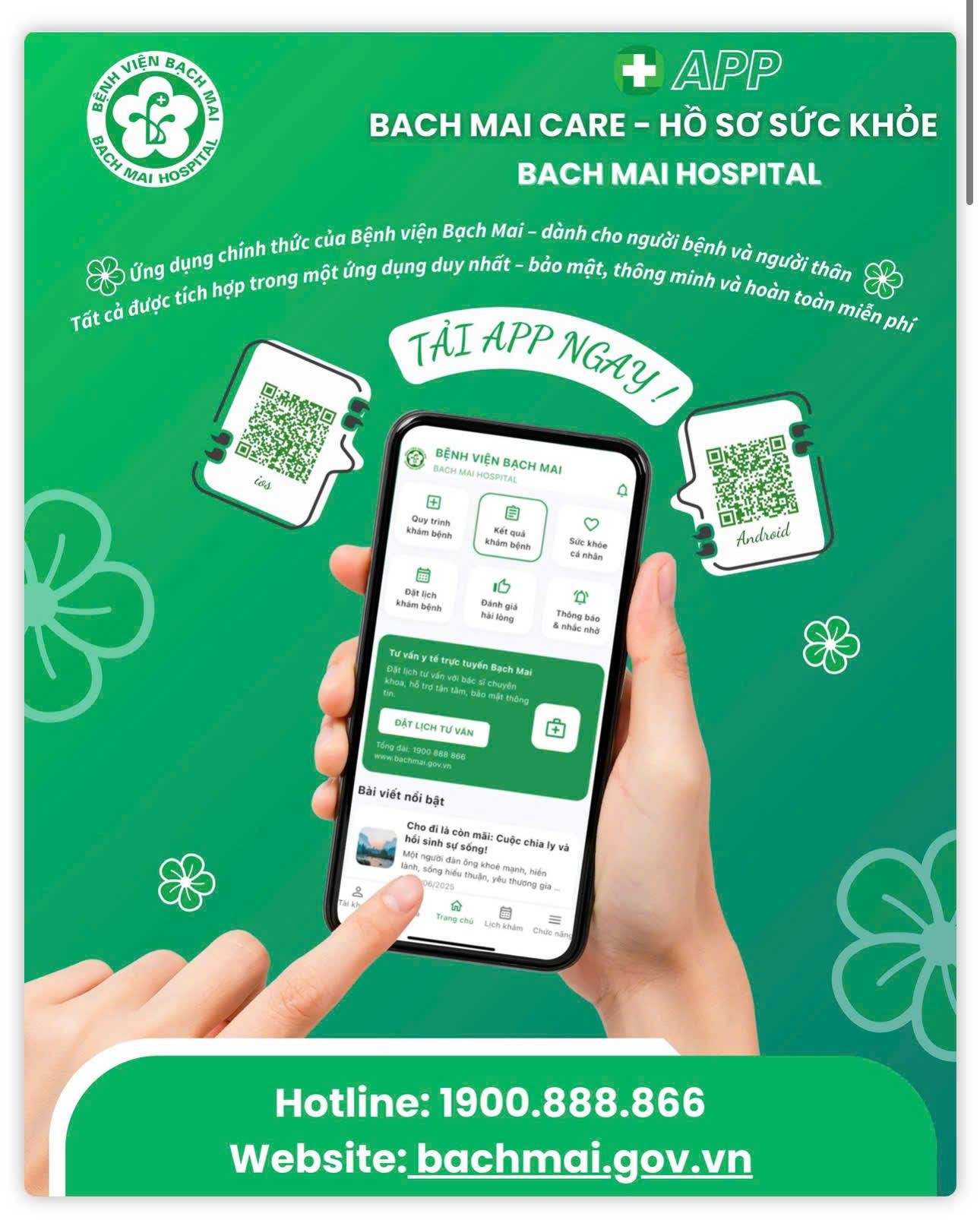 Nhằm giảm tải áp lực cho tổng đài, đồng thời mang đến trải nghiệm khám bệnh văn minh, chủ động và thuận tiện hơn, Bệnh viện Bạch Mai khuyến nghị người dân ưu tiên sử dụng ứng dụng Bạch Mai Care - “trợ lý sức khỏe” thông minh ngay trên điện thoại. Đây là một mắt xích quan trọng trong lộ trình xây dựng bệnh viện thông minh, không giấy tờ, hướng tới phục vụ người bệnh tốt hơn trong kỷ nguyên số.