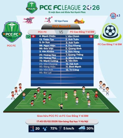 Ngày đăng: 12/02/2026Tác giả: Trường Cao đẳng y tế Bạch MaiTrong không khí rộn ràng những ngày cuối năm Ất Tỵ, chiều tối ngày 5/2 vừa qua, Trường Cao đẳng Y tế Bạch Mai đã phối hợp cùng Trung tâm Chống độc - Bệnh viện Bạch Mai tổ chức buổi giao lưu bóng đá giữa hai đội FC BMC và FC PCC. Hoạt động không chỉ mang ý nghĩa thể thao, mà còn là dịp ý nghĩa để tăng cường sự gắn kết giữa các đơn vị, lan tỏa tinh thần đoàn kết, sẻ chia và xây dựng môi trường làm việc tích cực trong đại gia đình Bạch Mai.
