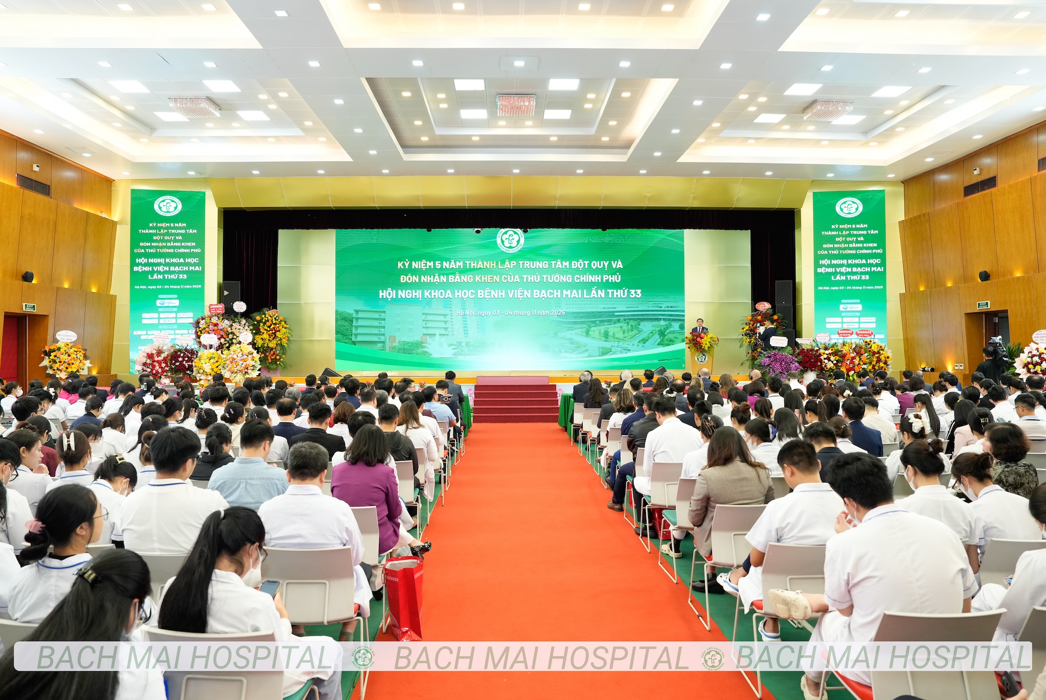 Ngày đăng: 03/11/2025Tác giả: Nguyên Hà - Thành DươngSáng 3/11, Bệnh viện Bạch Mai khai mạc Hội nghị Khoa học lần thứ 33, đồng thời kỷ niệm 5 năm thành lập Trung tâm Đột quỵ và đón nhận Bằng khen của Thủ tướng Chính phủ. Sự kiện được xem là diễn đàn học thuật lớn nhất của Bệnh viện Bạch Mai, nơi quy tụ hàng trăm nhà khoa học, chuyên gia, nhà quản lý trong và ngoài nước cùng chia sẻ tri thức, cập nhật tiến bộ y học và thảo luận hướng đi mới của ngành Y Việt Nam trong thời đại chuyển đổi số.