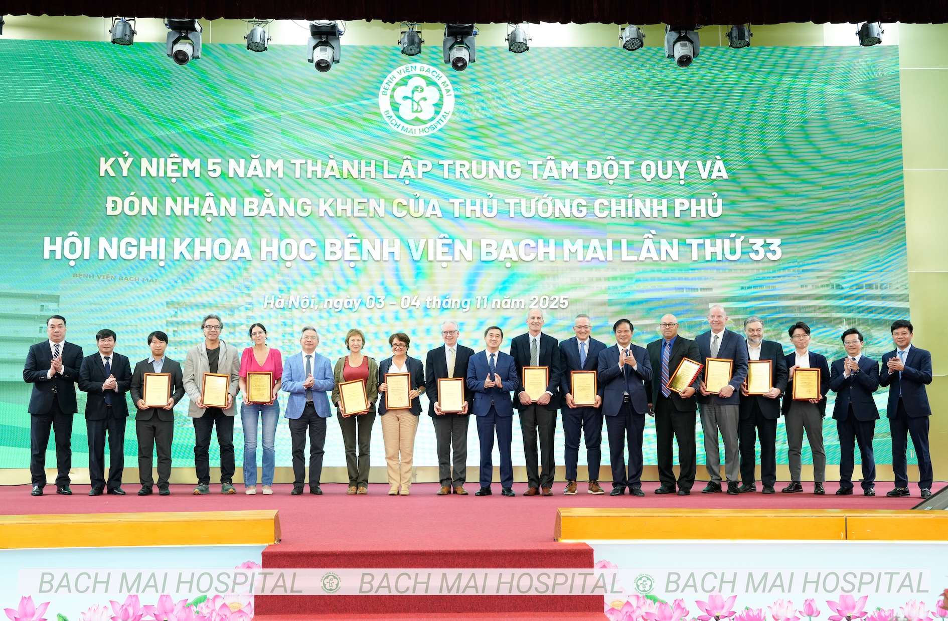 Lễ khai mạc khép lại trong không khí trang trọng và ấm áp với phần vinh danh 19 tập thể, 14 cá nhân tiêu biểu có đóng góp lớn cho sự phát triển của Trung tâm Đột quỵ, cùng 12 giáo sư, nhà khoa học quốc tế đã đồng hành cùng Bạch Mai trong nhiều năm qua.