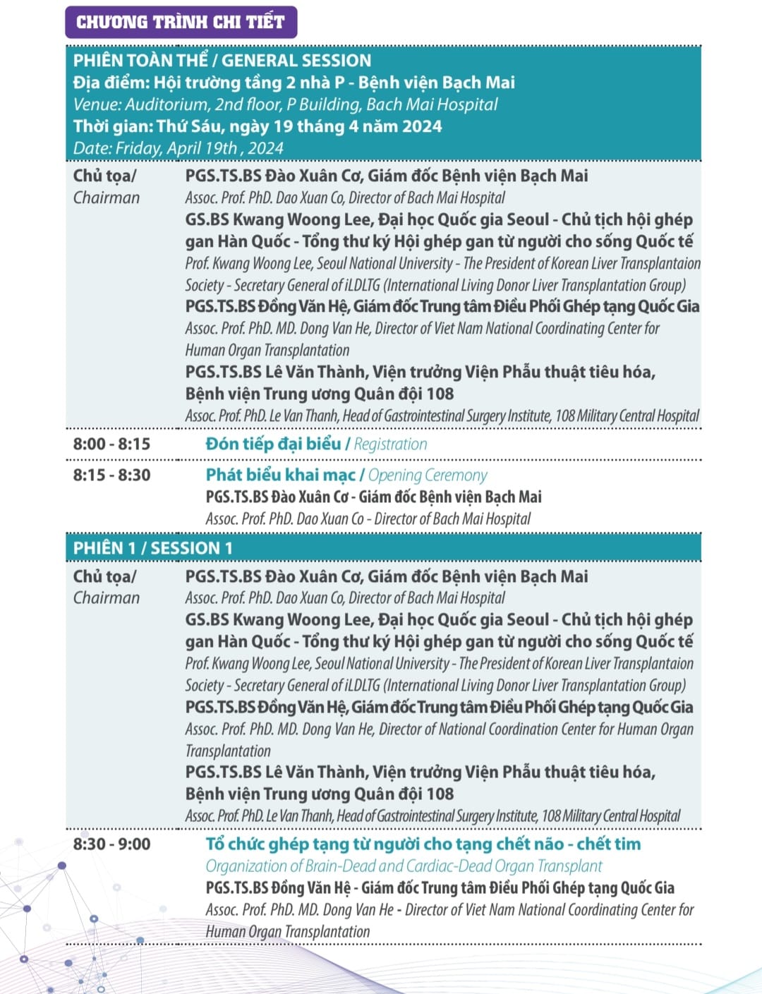 Chương trình có sự tham gua của GS. Kwang Woong Lee, Đại học Quốc gia Seoul - Chủ tịch Hội ghép gan Hàn Quốc, Tổng thư ký Hội ghép gan từ người cho sống Quốc tế. Ông là một chuyên gia hàng đầu thế giới về ghép gan. Bên cạnh đó là sự tham gia của các GS, BS đầu ngành về ghép gan, ghép tạng của Việt Nam đến từ Bệnh viện Bạch Mai, BV Việt Đức, BV TWQĐ 108....