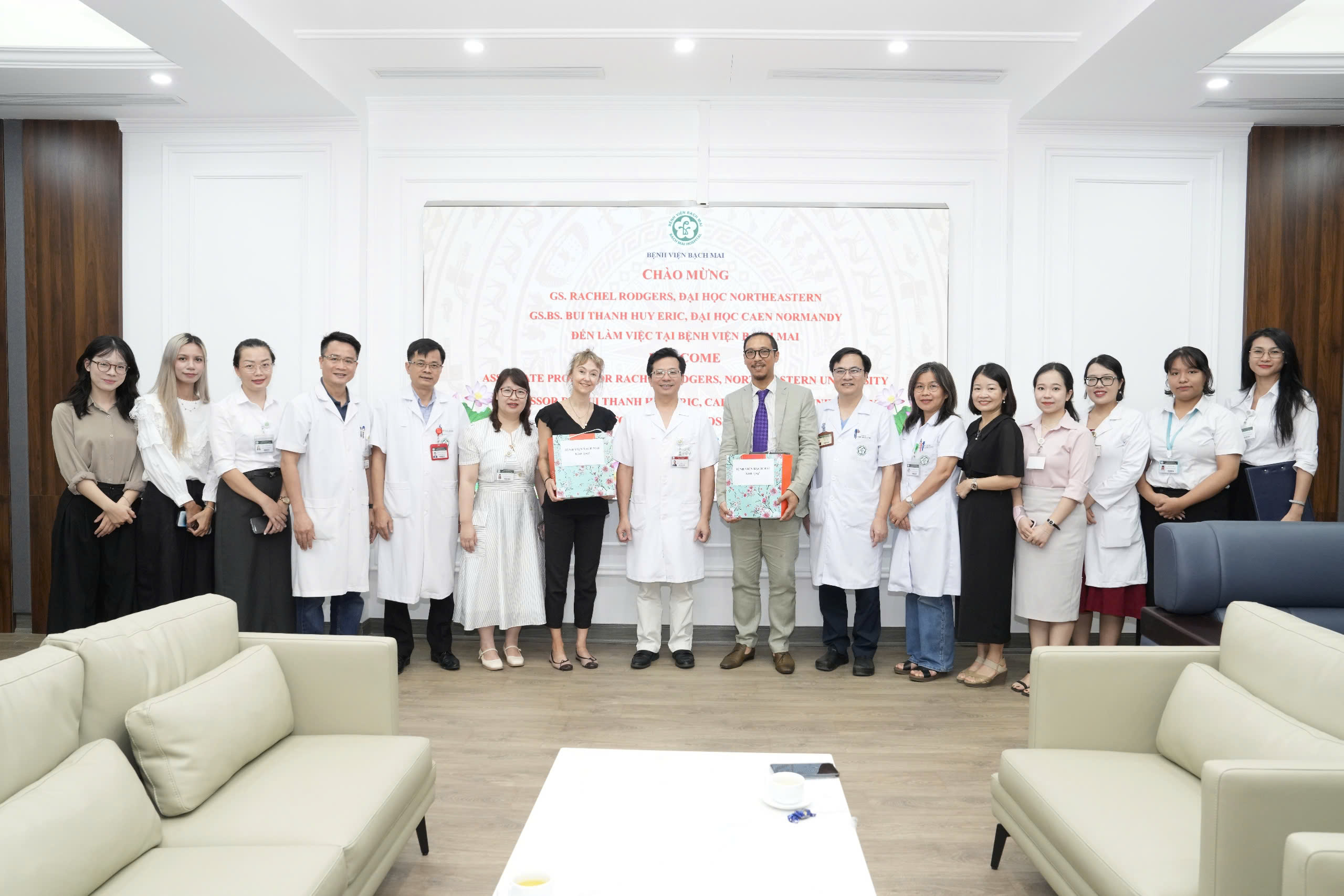 PGS.TS Vũ Văn Giáp - Phó giám đốc Bệnh viện (mặc áo blue, đứng giữa) gửi lời cảm ơn và tặng quà lưu niệm cho Giáo sư Rachel Rodgers và Giáo sư Bui Thanh-Huy Eric
