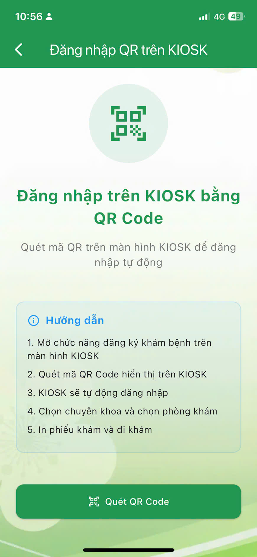 Ứng dụng sẽ mở camera. Bạn đưa điện thoại lên quét mã QR hiển thị trên màn hình của cây Kiosk (tương tự như cách quét mã đăng nhập Zalo trên máy tính).