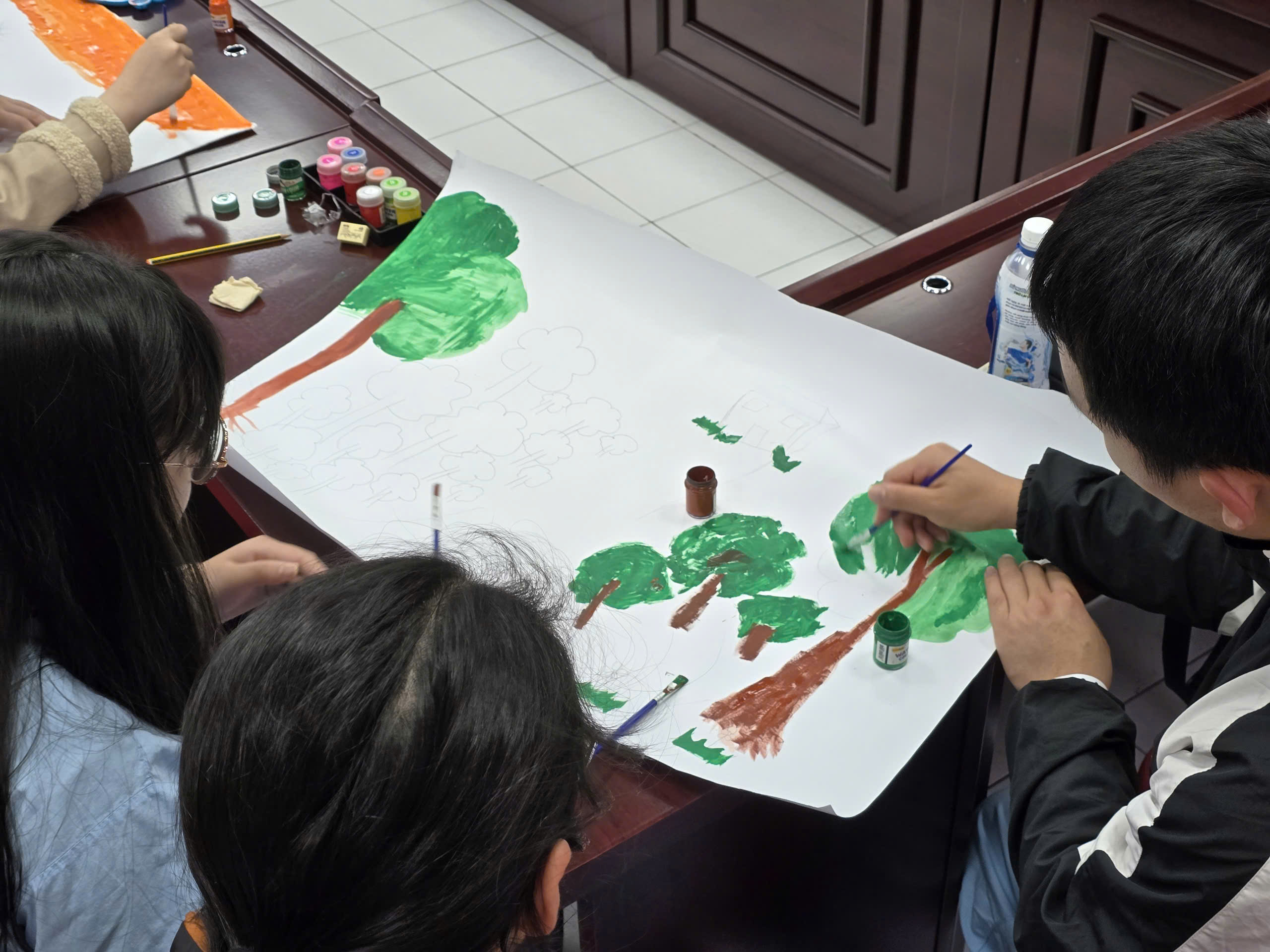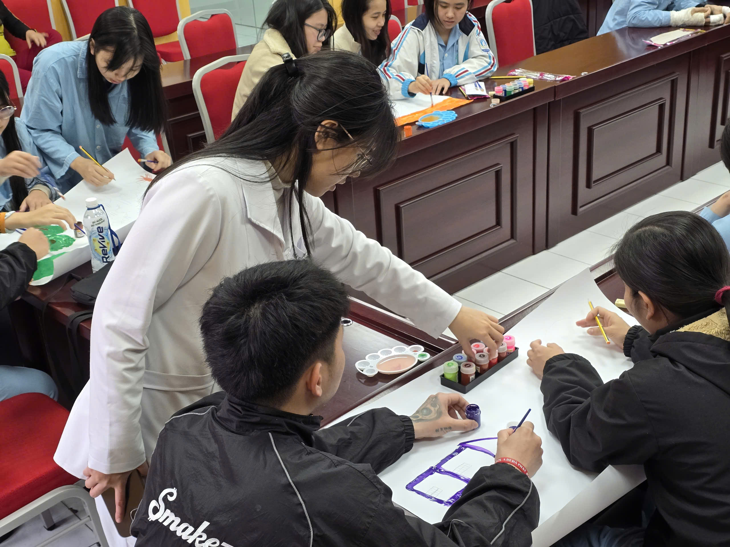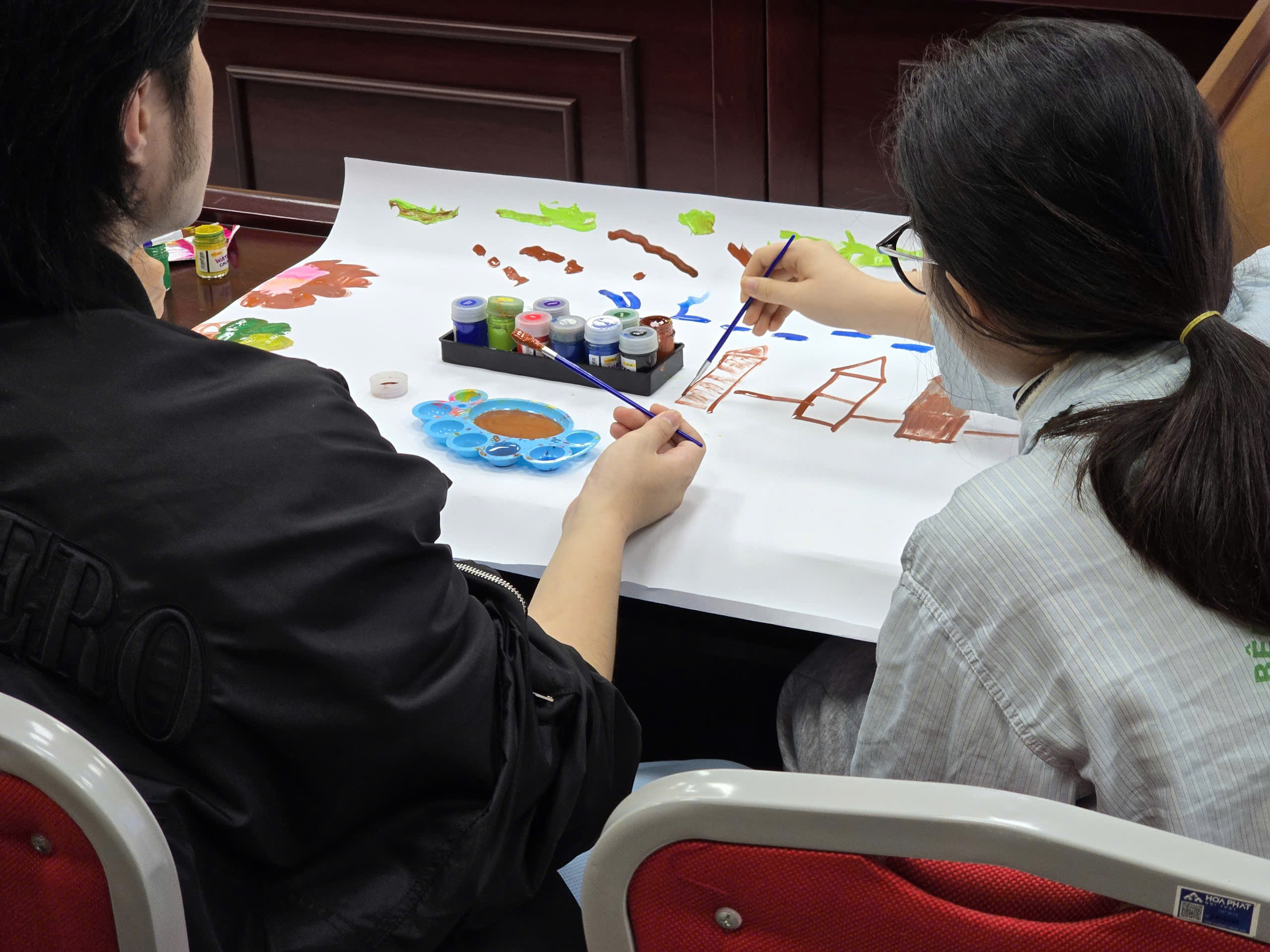 Trên một tờ giấy lớn, ranh giới giữa "bác sĩ" và "người bệnh" dường như bị xóa nhòa. Mỗi người phụ trách một mảng màu: người vẽ bầu trời, người vẽ nhân vật, người thêm vào những biểu tượng cảm xúc. Những câu hỏi nhỏ như "Bạn sẽ vẽ gì?", "Tôi có thể thêm gì bên cạnh hình của bạn?"… đã trở thành sợi dây kết nối, giúp những người tham gia mở lòng và tương tác với nhau một cách tự nhiên.