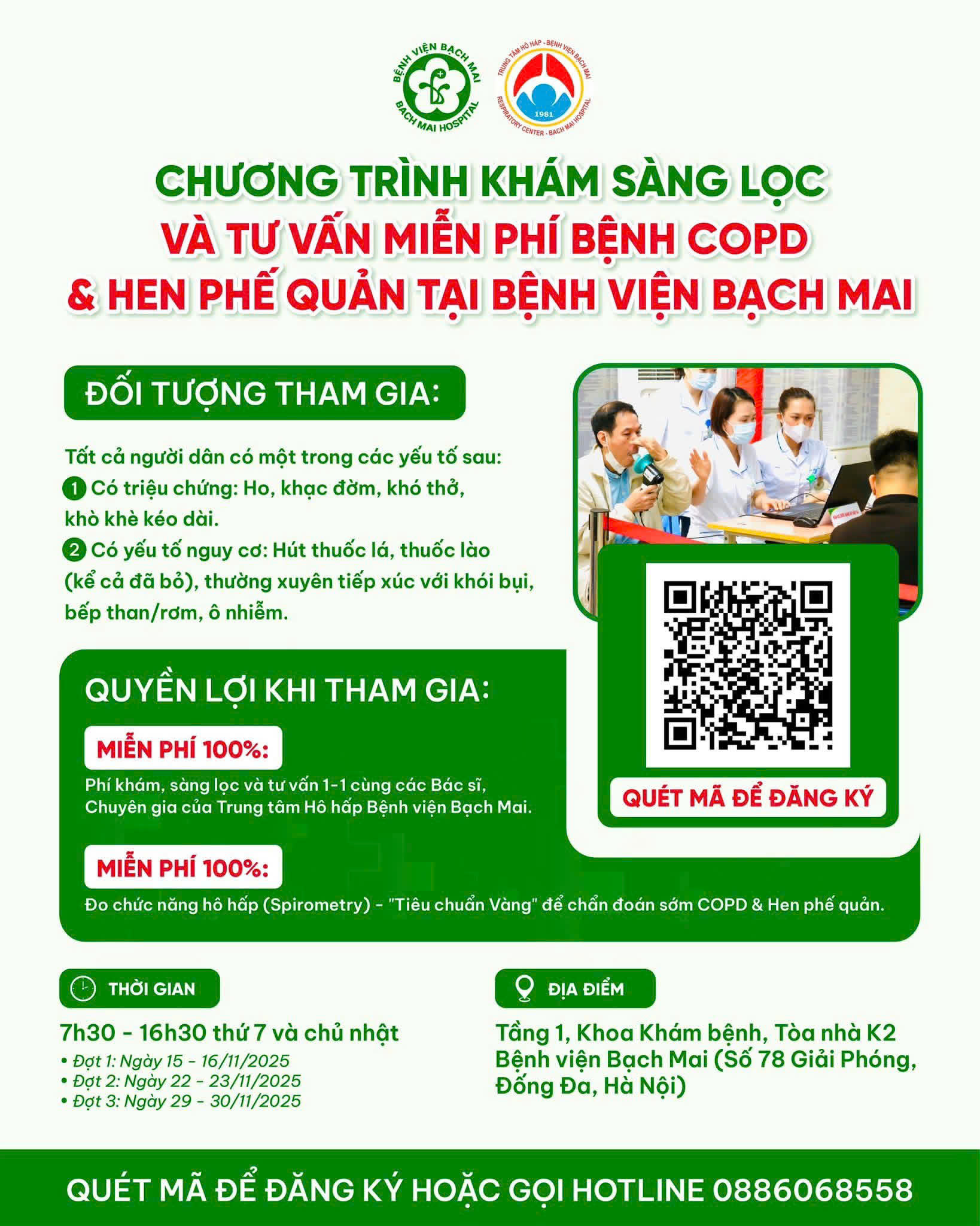 Ngày đăng: 14/11/2025Tác giả: Diệu HiềnHưởng ứng Ngày Bệnh phổi tắc nghẽn mạn tính (COPD) toàn cầu 2025, Bệnh viện Bạch Mai tổ chức chương trình KHÁM SÀNG LỌC VÀ TƯ VẤN MIỄN PHÍ 100% cho nhóm nguy cơ cao (người hút thuốc, tiếp xúc khói bụi...). Đây là Cơ hội vàng để phát hiện bệnh sớm và cải thiện chất lượng cuộc sống của bạn!