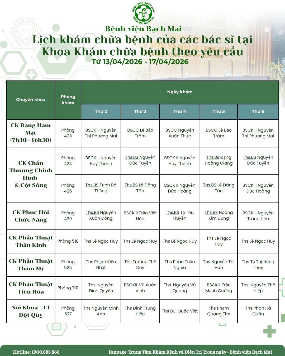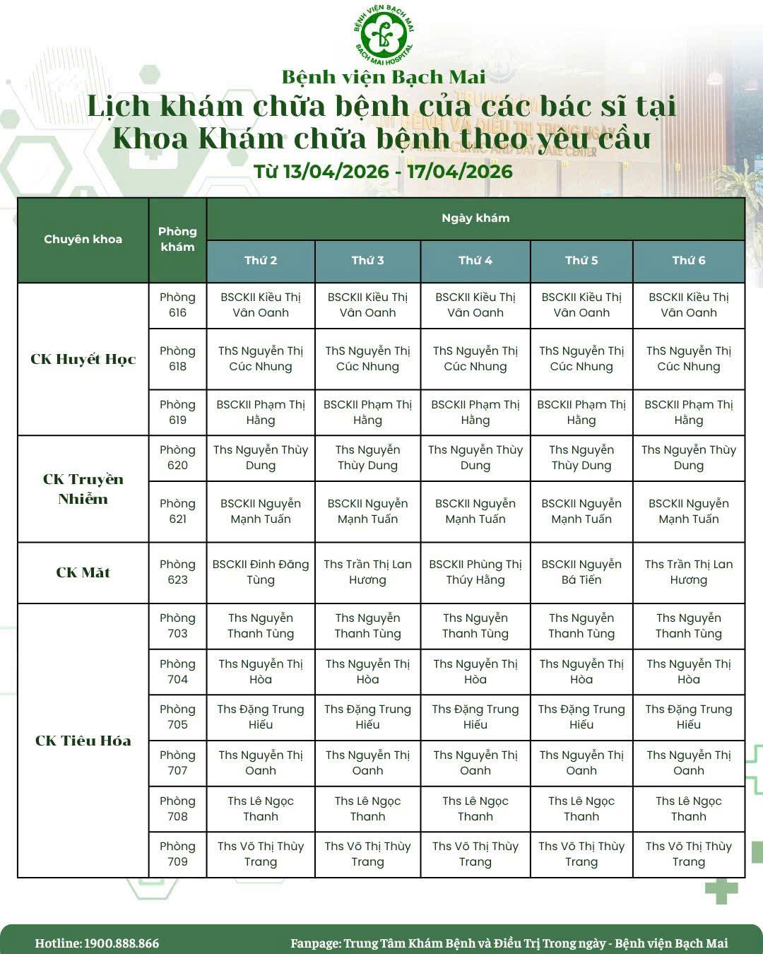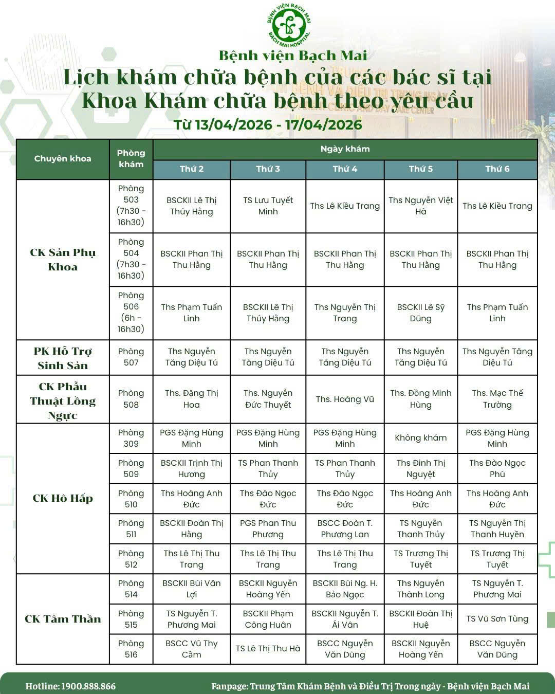 Lịch Khám và tư vấn theo yêu cầu (từ 13/4/2026 đến 17/4/2026)