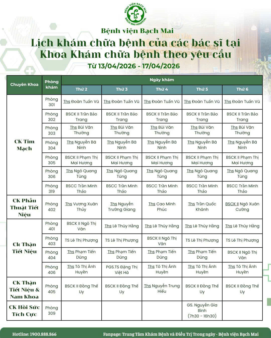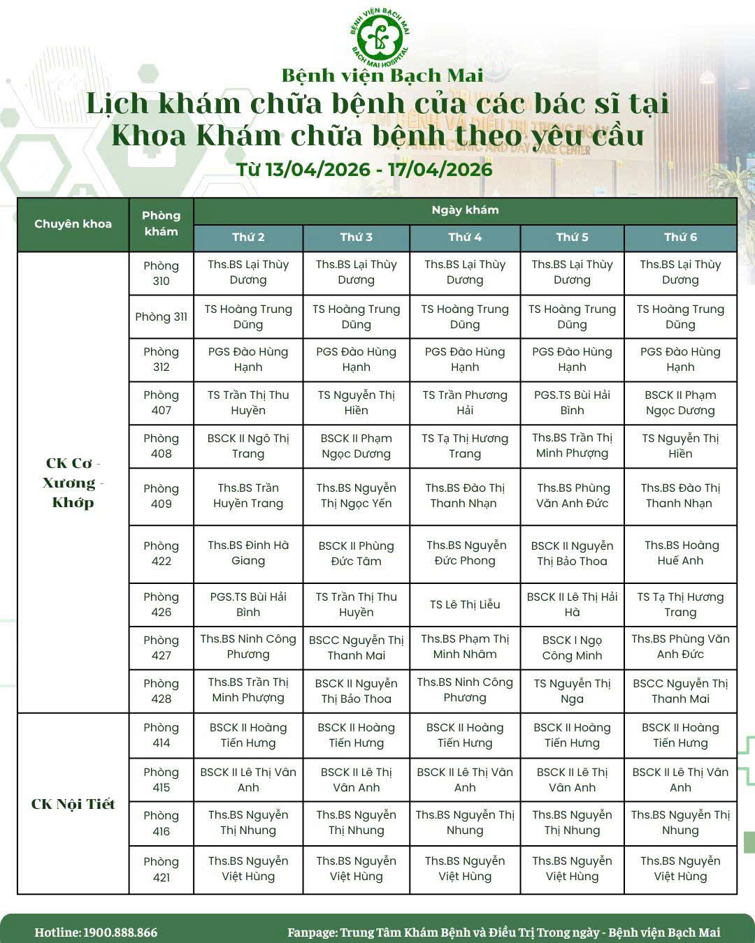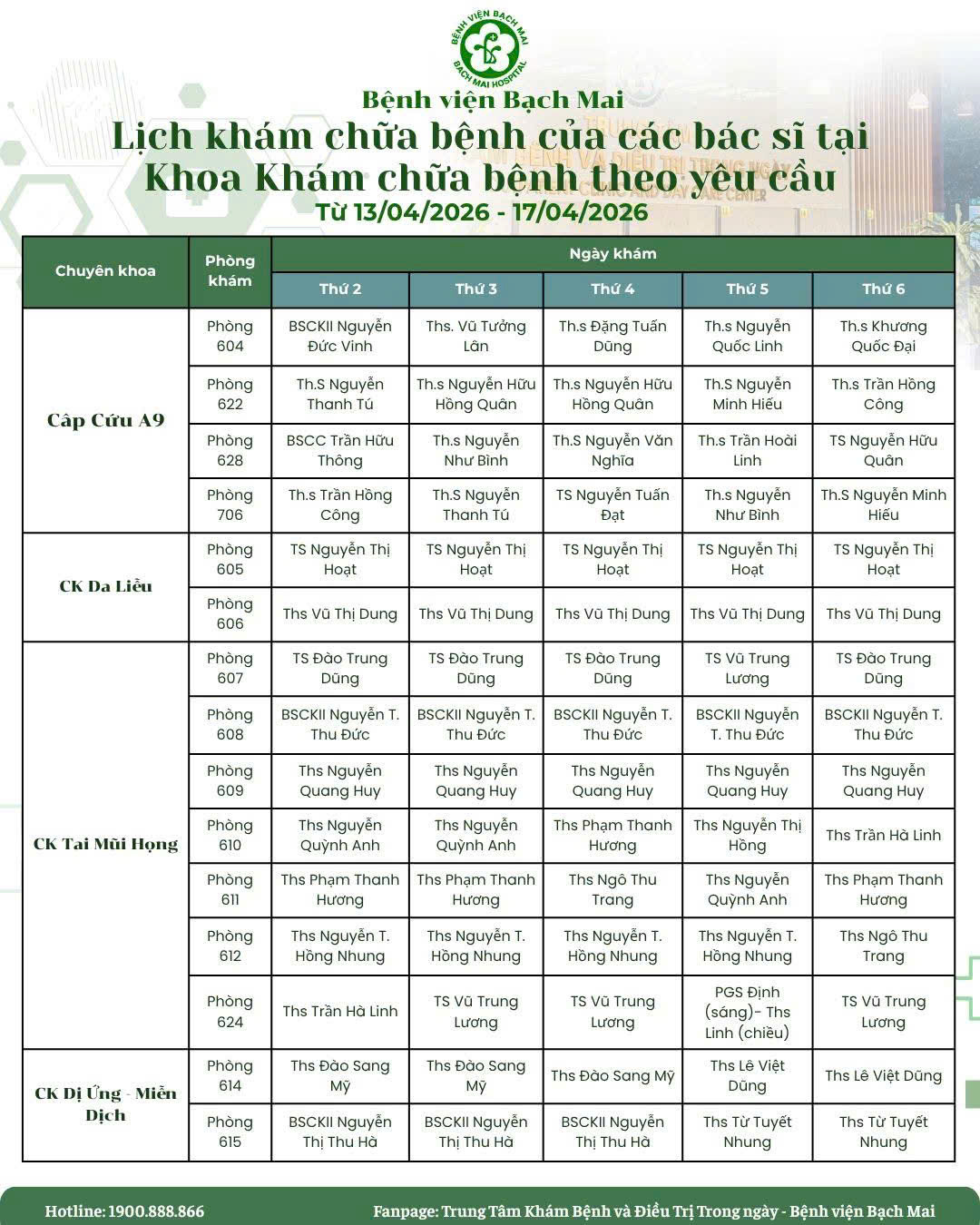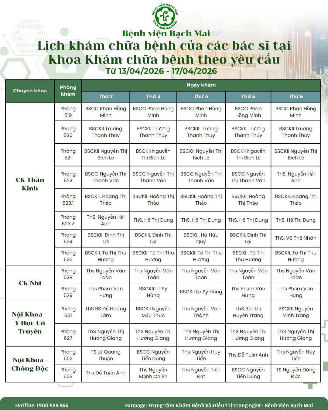 Lịch Khám và tư vấn theo yêu cầu (từ 13/4/2026 đến 17/4/2026)