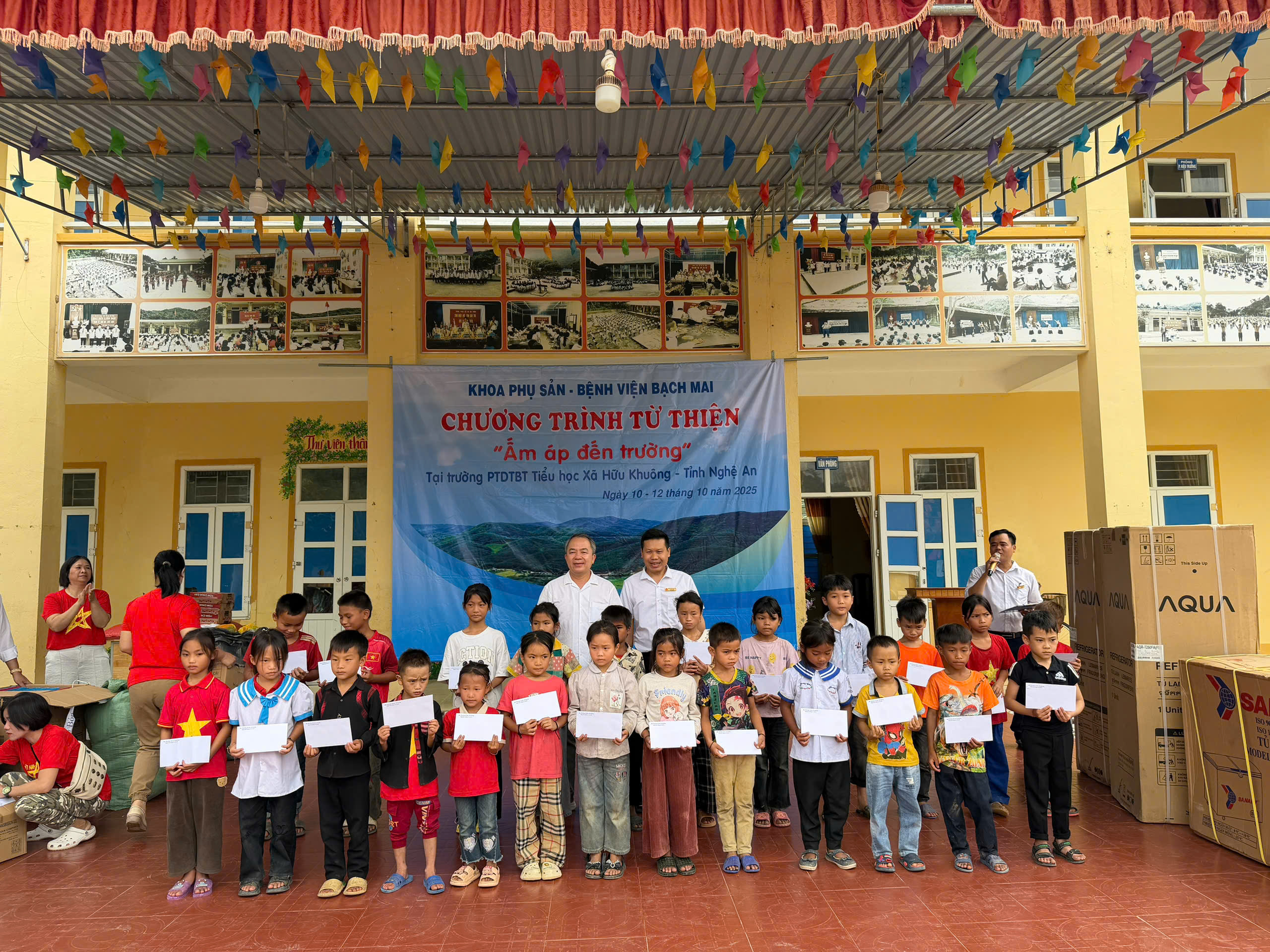 Cuối tuần vừa qua, vượt hàng trăm cây số với những con đường đèo quanh co, cách trở, các y bác sĩ khoa Phụ sản, Bệnh viện Bạch Mai đã đến được với các em học sinh tại điểm trường Phổ thông Dân tộc Bán trú Tiểu học Hữu Khuông, Nghệ An. Với những món quà ý nghĩa gồm nhu yếu phẩm, quần áo, vật dụng sinh hoạt, vật dụng nhà bếp và các suất học bổng, tổng trị giá quà tặng hơn 150 triệu đồng, các y bác sĩ hi vọng sẽ phần nào giúp cuộc sống của các em vơi bớt khó khăn, thiếu thốn.