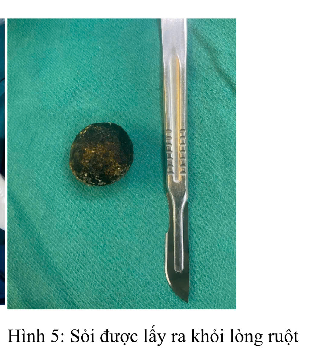 Với chẩn đoán xác định tắc ruột do sỏi mật/Đái tháo đường, Parkinson, bệnh nhân được đặt sonde dạ dày, truyền dịch, kháng sinh trước mổ để ổn định tình trạng. Sau một ngày điều trị nội khoa, bệnh nhân được phẫu thuật. Quá trình trong mổ, các phẫu thuật viên phát hiện trong ổ bụng có 500ml dịch vàng trong, các quai ruột non giãn ứ đọng hơi và dịch, cách góc hồi manh tràng 1m có dị vật cứng chiếm hết lòng ruột, quai ruột phía sau xẹp. Túi mật viêm teo dính vào tá tràng có đường rò túi mật hành tá tràng mặt trước kích thước 2cm. Viên sỏi túi mật hình tròn màu xanh đen kích thước khoảng 25mm đã được lấy ra khỏi lòng ruột.
