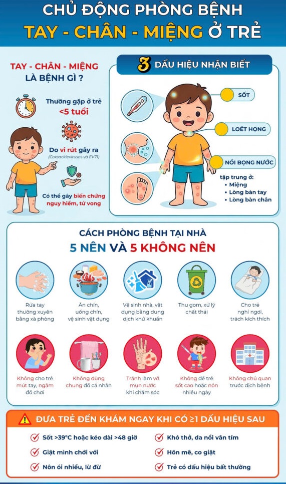 Tay chân miệng là bệnh thường gặp nhưng không thể xem nhẹ. Nhận biết sớm, theo dõi sát và đưa trẻ đi khám kịp thời chính là chìa khóa giúp bảo vệ an toàn cho trẻ trong mùa dịch.