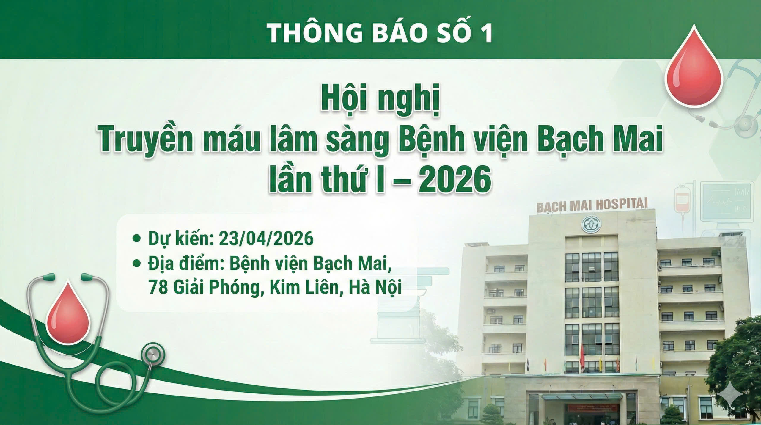 Nhằm tạo diễn đàn khoa học trao đổi chuyên môn, cập nhật kiến thức và chia sẻ thực tiễn, kinh nghiệm triển khai tại các cơ sở y tế, Bệnh viện Bạch Mai dự kiến tổ chức Hội nghị Truyền máu lâm sàng Bệnh viện Bạch Mai lần thứ I - 2026. Ban Tổ chức trân trọng kính mời Quý đồng nghiệp đăng ký tham dự và gửi bài báo cáo khoa học/chuyên đề cho Hội nghị. Cụ thể: