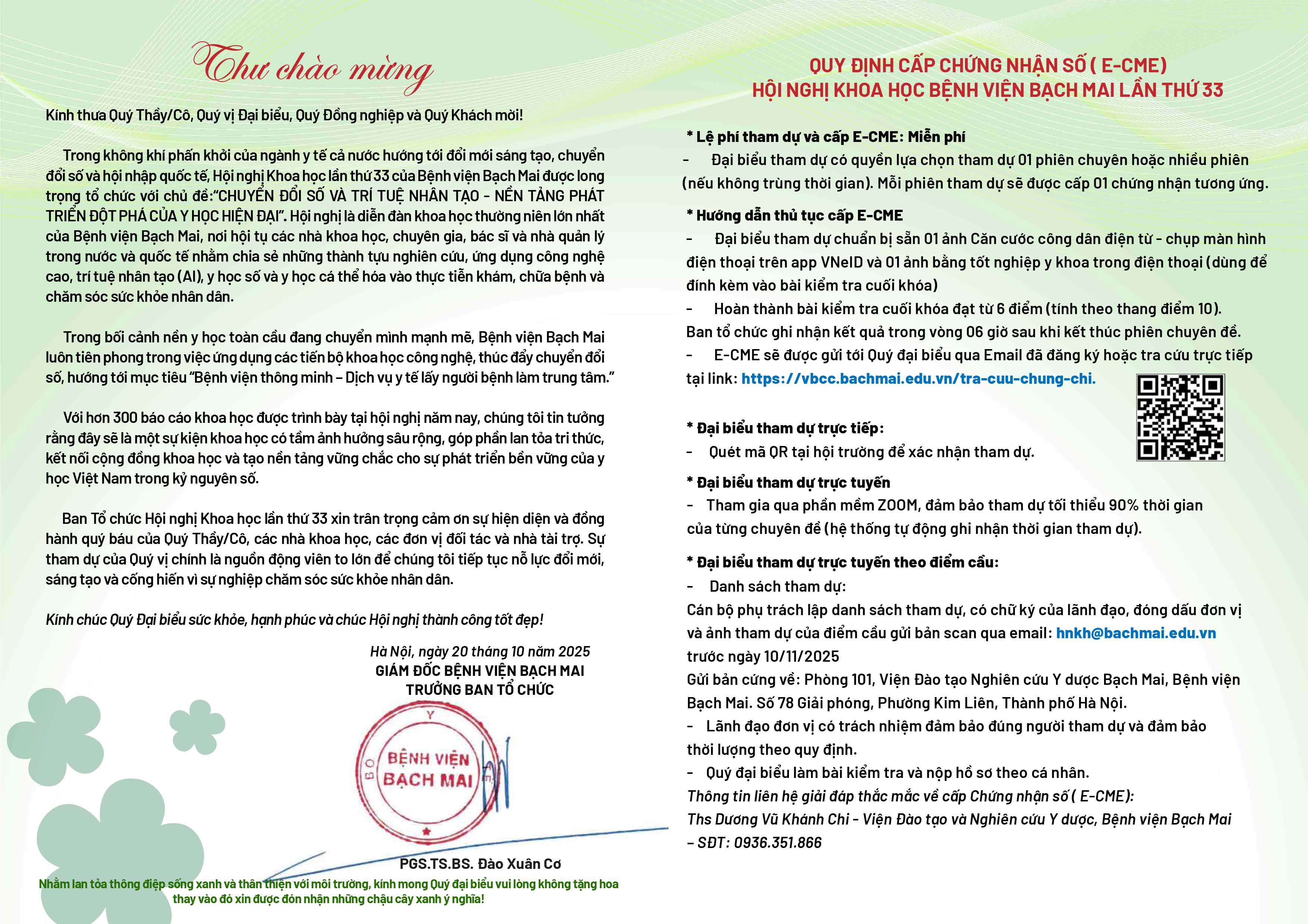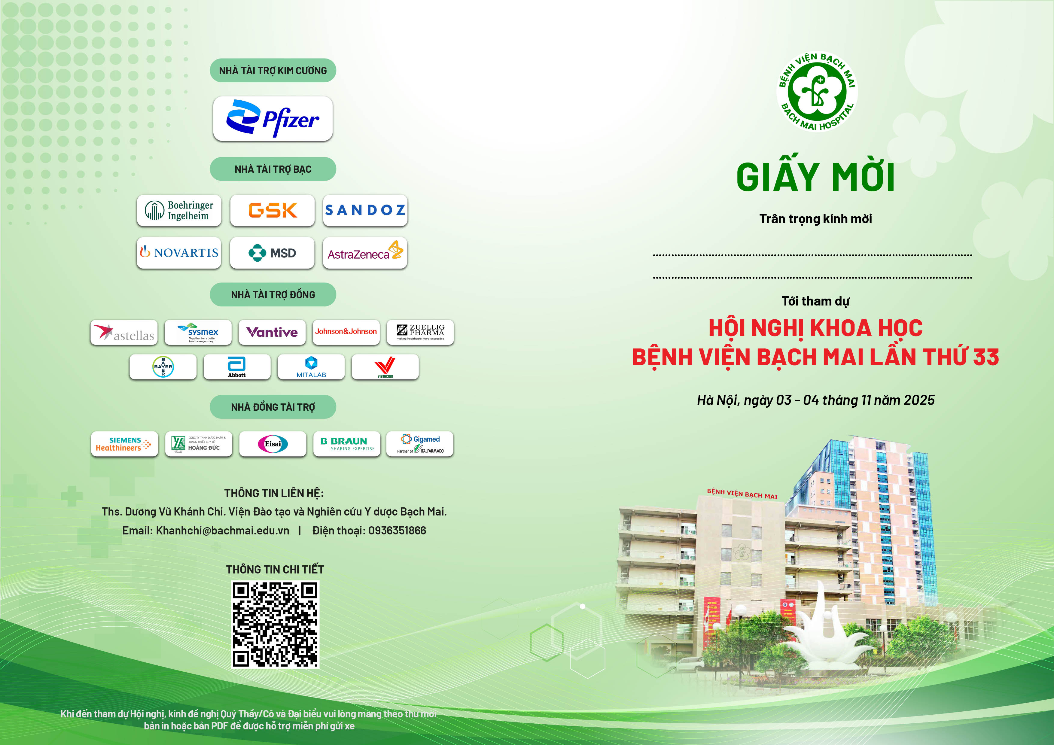 Ban Tổ chức Hội nghị Khoa học lần thứ 33 xin trân trọng cảm ơn sự hiện diện và đồng hành quý báu của Quý Thầy/Cô, các nhà khoa học, các đơn vị đối tác và nhà tài trợ. Sự tham dự của Quý vị chính là nguồn động viên to lớn để chúng tôi tiếp tục nỗ lực đổi mới, sáng tạo và cống hiến vì sự nghiệp chăm sóc sức khỏe nhân dân.
