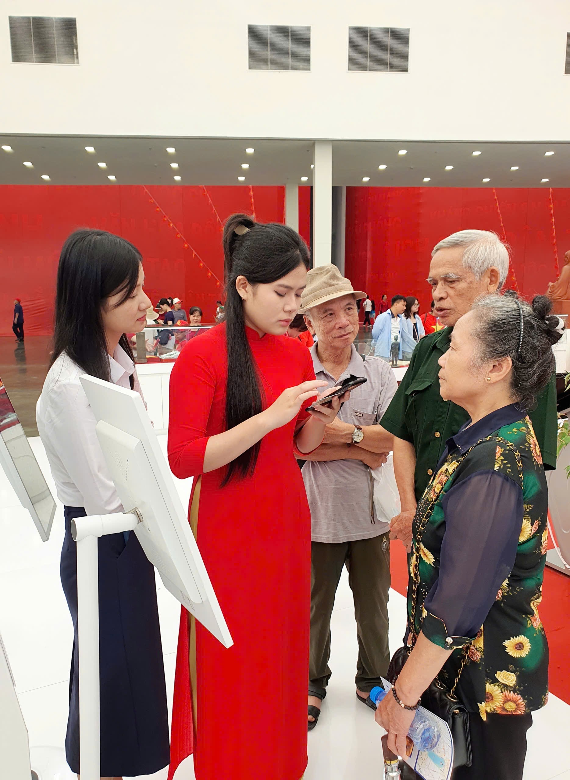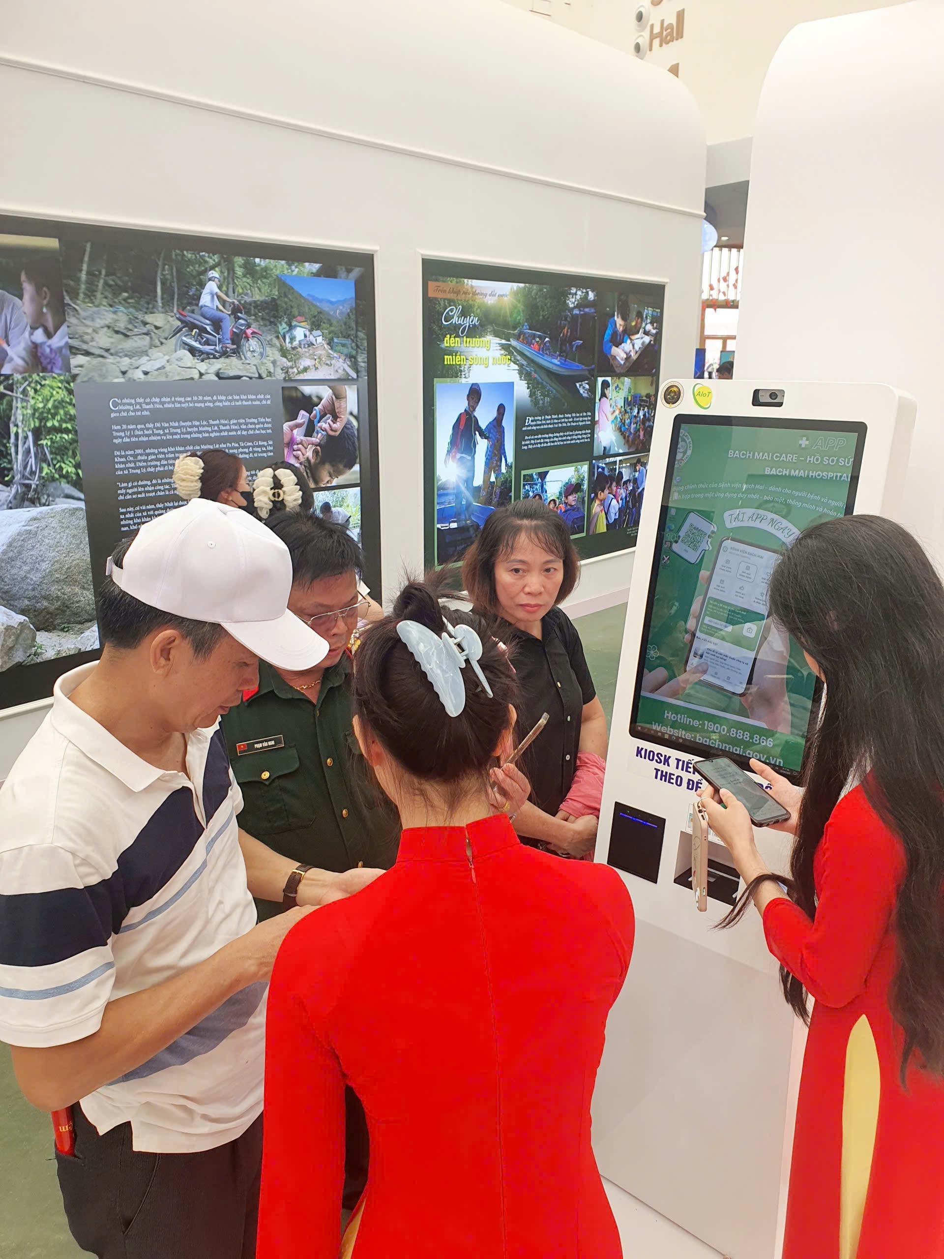 Sinh viên Cao đẳng Y tế Bạch Mai hướng dẫn người dân cài app Bạch Mai Care tại Triển lãm thành tựu 80 năm