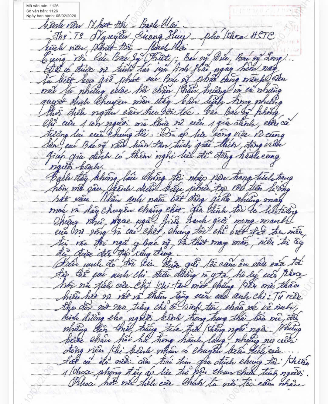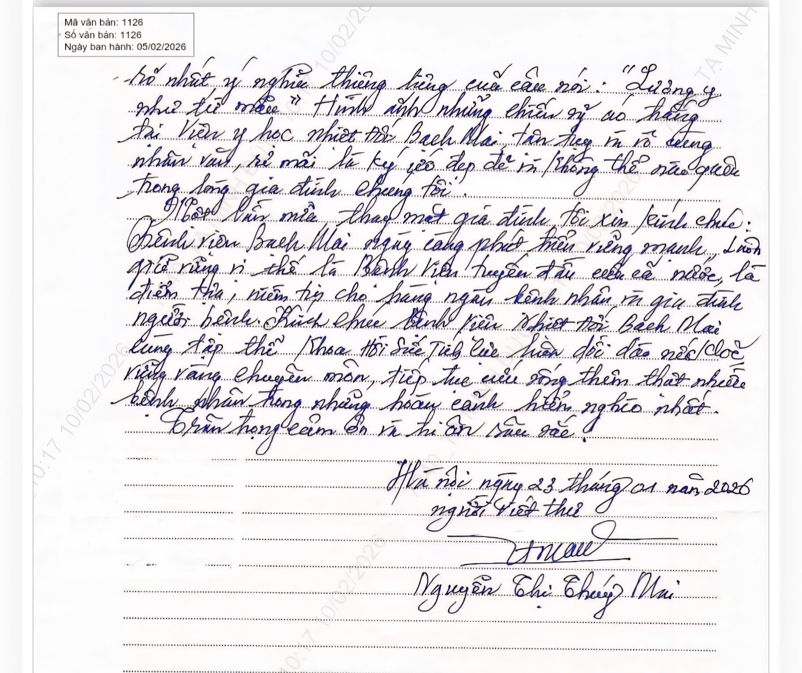 Giữa những ngày cuối năm ấy, Bệnh viện Bạch Mai nhận được lá thư tay xúc động của gia đình bệnh nhân Trần Thượng Hải. Lá thư không chỉ là lời tri ân dành cho đội ngũ y bác sĩ, mà còn là câu chuyện về y đức, về sự dẫn dắt tận tâm và đầy trách nhiệm của người đứng đầu bệnh viện.
