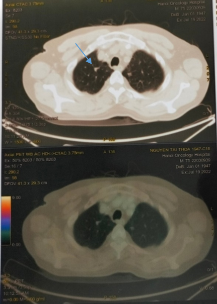 Hình ảnh CT (phía trên) và PET/CT (phía dưới) thấy các nốt nhu mô phổi phải có tăng nhẹ chuyển hóa FDG