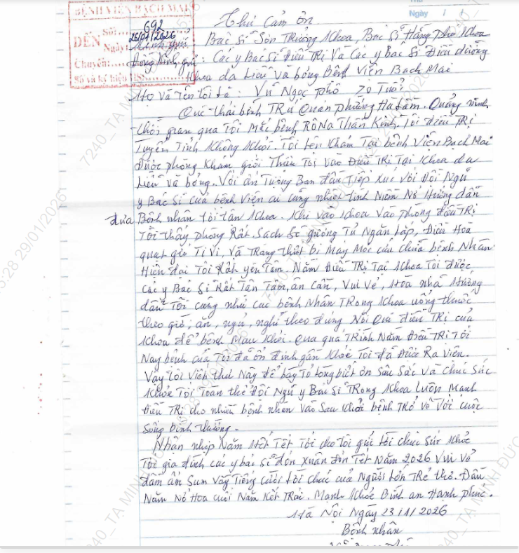Ngày đăng: 26/01/2026Bach Mai Hospital has recently received a heartfelt letter from Mr. Vu Ngoc Pho, a patient who was successfully treated for herpes zoster (shingles) at the Dermatology and Burns Department.