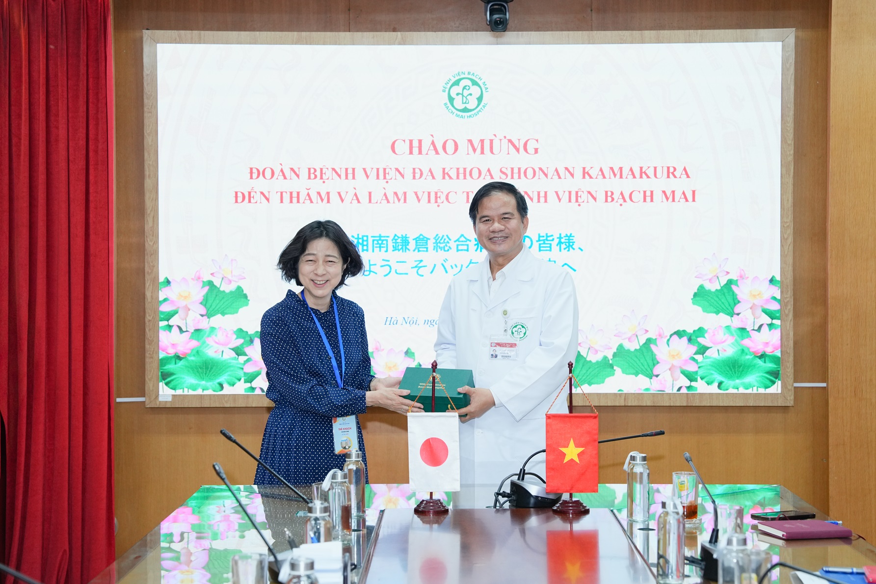 Assoc. Prof. Dr. Dao Xuan Co presented a commemorative gift from Bach Mai Hospital to Ms. Motoko Omura