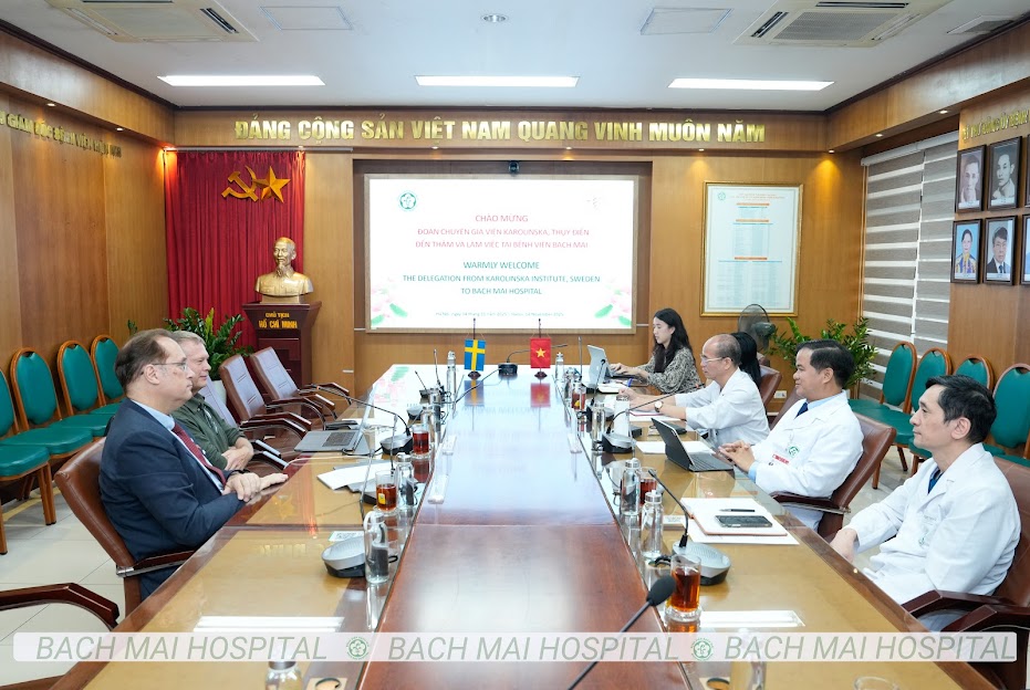 Ngày đăng: 15/11/2025Tác giả: VPBV - CTXHOn the morning of November 14, 2025, Bach Mai Hospital welcomed and held a working session with a delegation of experts from the Karolinska Institute (Sweden) — one of the world’s most prestigious medical universities and the institution responsible for selecting and awarding the Nobel Prize in Physiology or Medicine.
