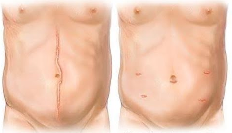 Hình 7: So sánh giữa vết mổ mở (bên trái) và vết mổ nội soi hoàn toàn (bên phải) trong trường hợp ung thư đại trực tràng di căn gan
